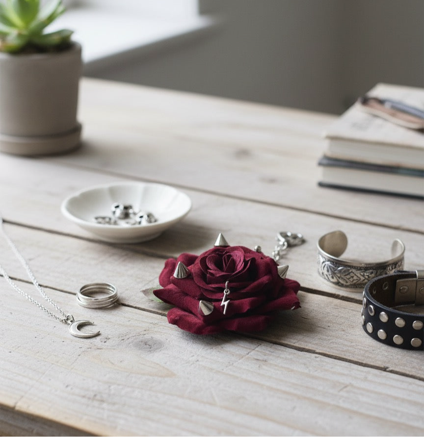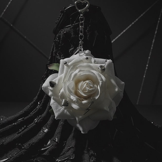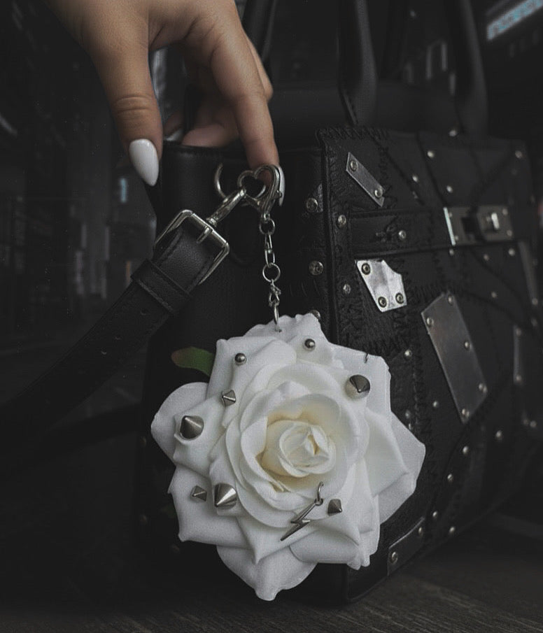 A rose of fire and shadow, the Seraphine Keychain blooms in crimson—passion wrapped in darkness. Its fabric petals, rich in red, are pierced with studs, spikes, and metalwork, transforming beauty into defiance. From its chain hang a lightning charm, fierce and untamed, and a bullet point charm, a reminder of power carried quietly.