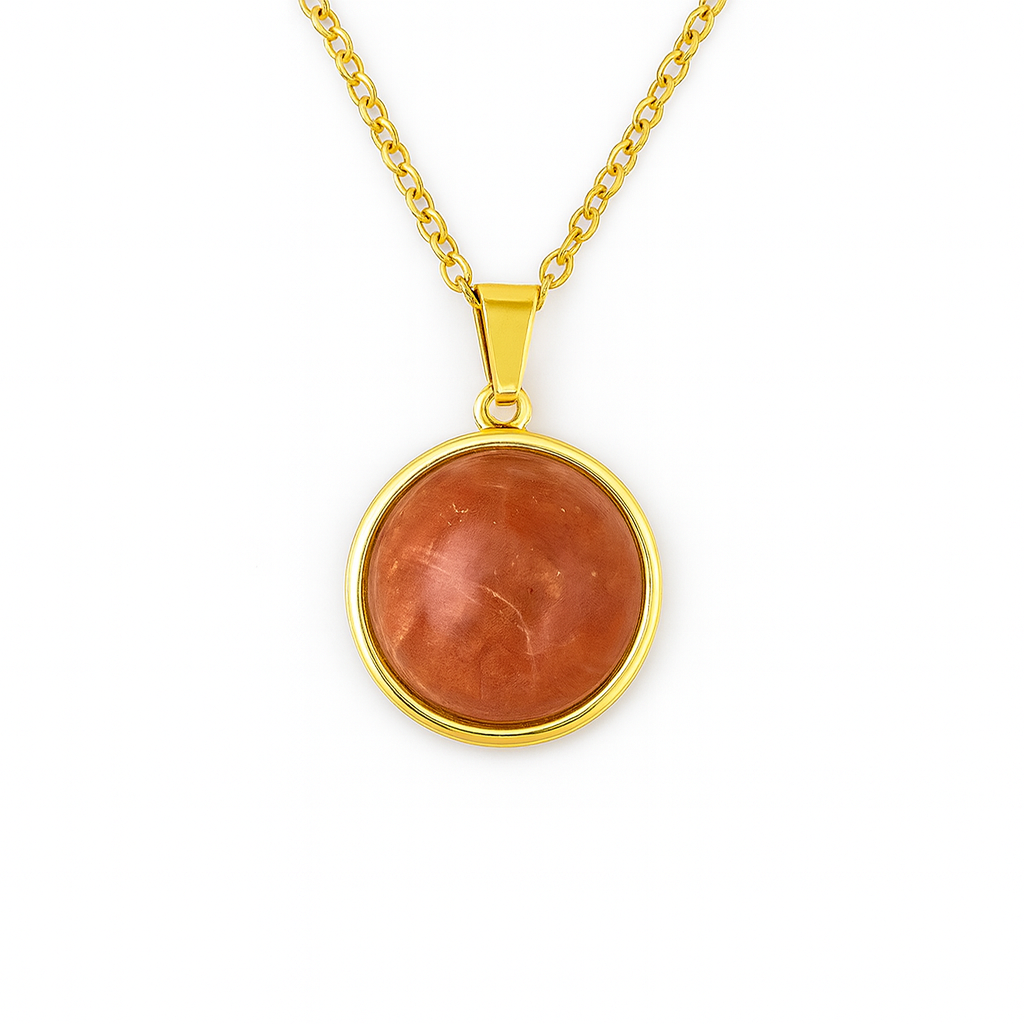 Natural Orange Sunstone: This pendant necklace showcases a captivating 20mm diameter natural Orange Sunstone, radiating warmth and vitality, set against an elegant gold stainless steel base.