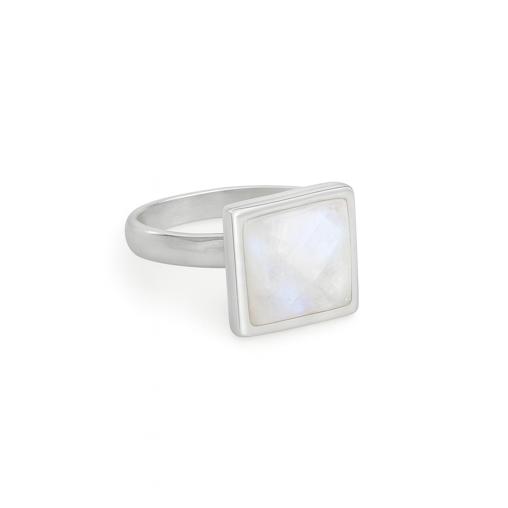 A luminous portal to intuition and inner light, this handcrafted rainbow moonstone ring embodies quiet strength and spiritual clarity. The faceted square-cut stone shimmers with ethereal flashes, symbolizing cycles, self-discovery, and feminine wisdom. Designed with a hidden adjustable band for a seamless look, this piece blends everyday wearability with mystical energy. Handmade in our home studio, it’s a talisman for those drawn to the moon’s rhythm and the magic of transformation.