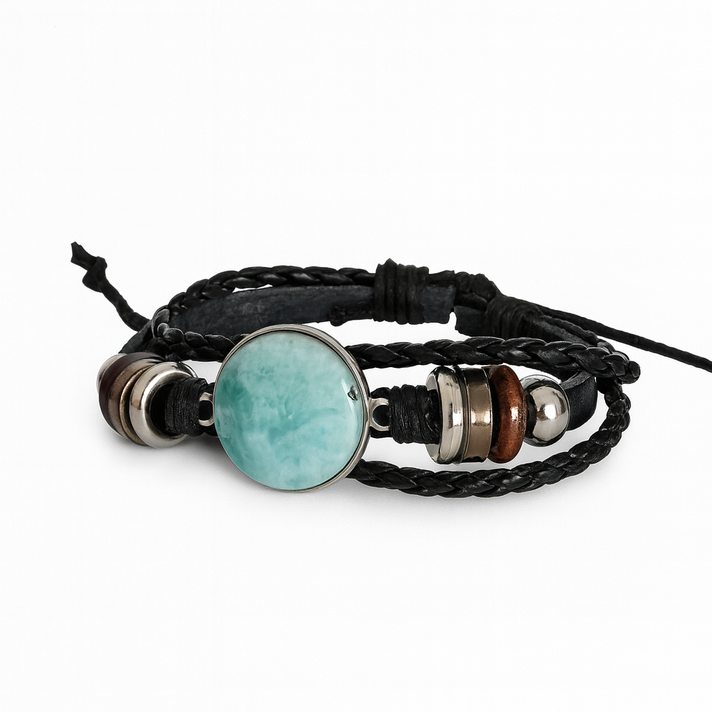 Grounding strength meets oceanic serenity in this handcrafted layered bracelet stack. Designed with braided textures, polished beads, and supple faux leather, the piece carries both rugged masculinity and refined detail. At its center rests a 20mm natural Larimar gemstone—its tranquil blues and soft marbling reflecting the calm of Caribbean waters and the rhythm of flowing tides.