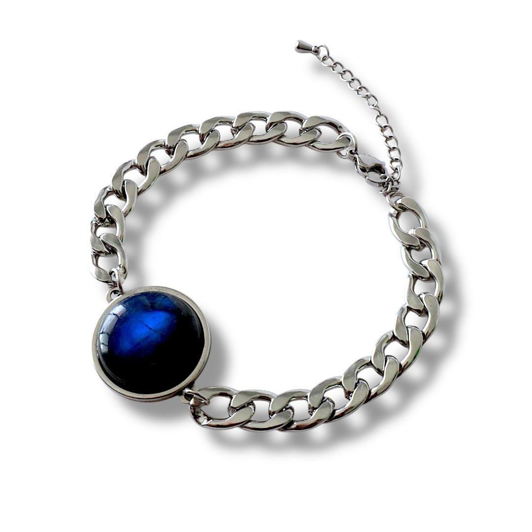 The Blue Mirage Bracelet captures the magic of movement and light with a striking 20mm AAA-grade blue labradorite cabochon, alive with electric flashes that dance from bright azure to deep indigo. Set in cool silver stainless steel and paired with a bold 8mm Cuban chain, this bracelet blends mysticism with a clean, structured silhouette. The adjustable lobster clasp ensures comfort and adaptability, while the luminous labradorite serves as a reminder of what lies beneath the surface—intuition, transformation, and the mystery of becoming.
