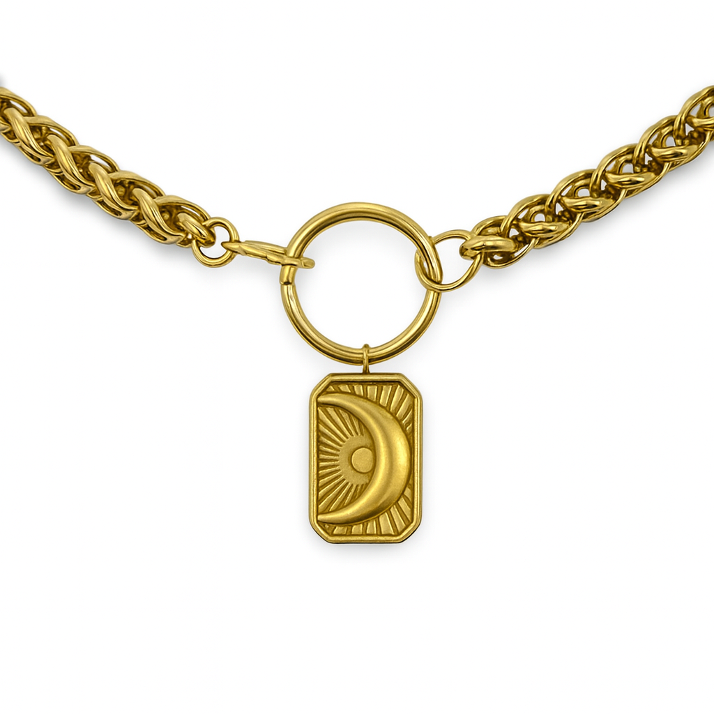 Chic Design: An elegant Crescent Moon Pendant on a Gold O-ring design, showcased on a durable Stainless Steel Chunky Wheat Chain for sophistication and sturdiness.