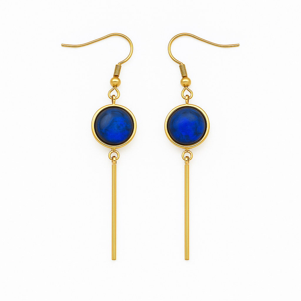 Mystical light in motion, the Kala Earrings embody elegance woven with transformation. Handcrafted from stainless steel and plated in radiant 18k gold PVD, each earring features a polished 12mm blue labradorite gemstone set in a sleek bezel, suspended from a delicate ear wire. Beneath, a slender golden stick charm sways with every movement, adding fluidity and contemporary edge to the design.