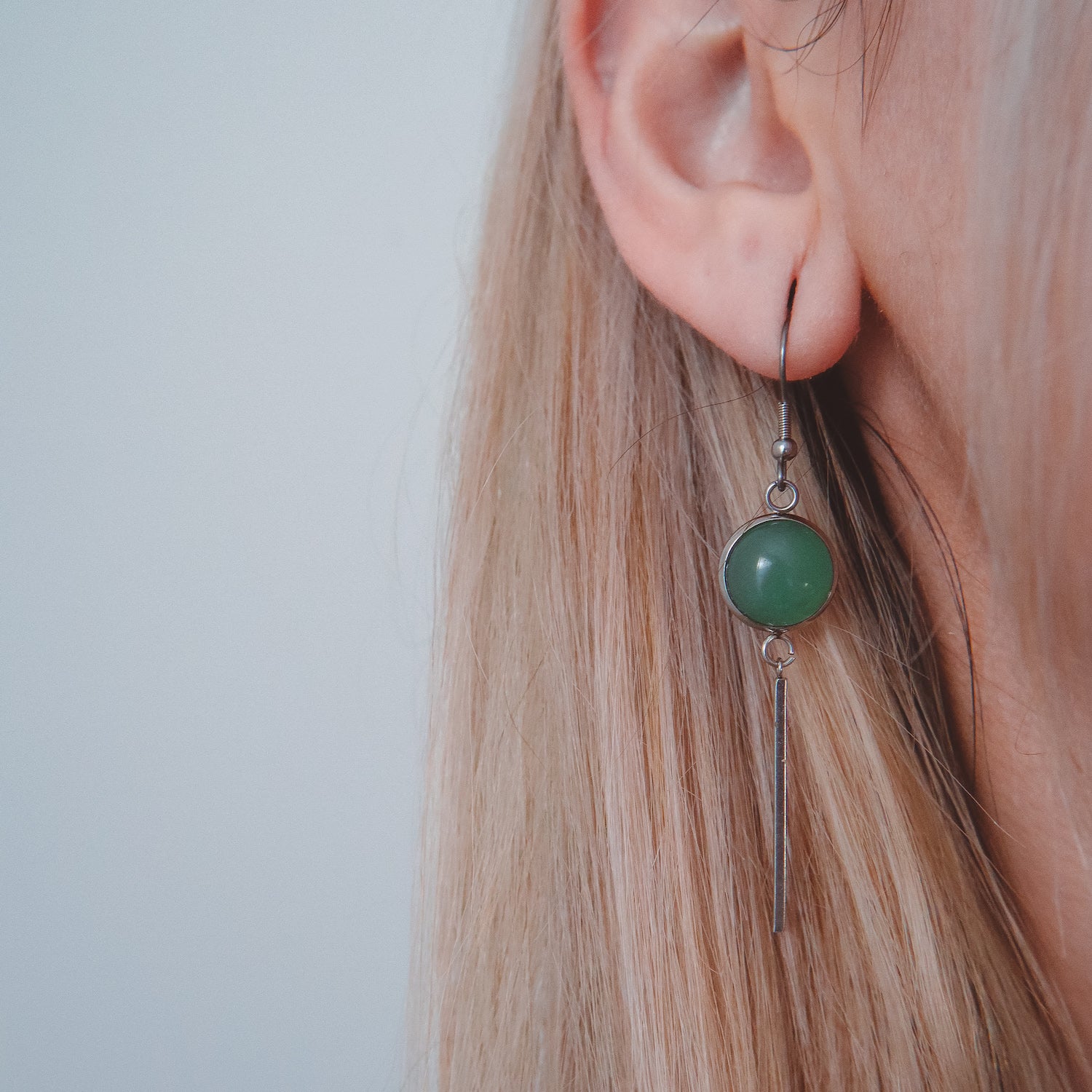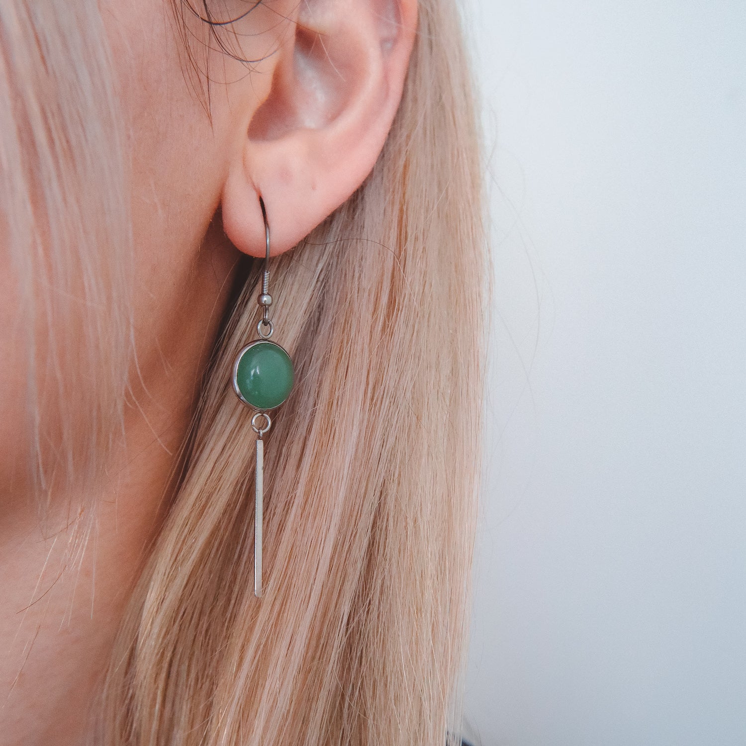 Moonlit shadows meet ocean fire in the KALA earrings, a design that captures the quiet alchemy of light and stone. At the center rests a polished blue labradorite gemstone, shimmering with hues of blue, grey, and silver that shift like water beneath starlight. Suspended below, a slender silver stick charm adds graceful movement, balancing clean minimalism with a touch of drama.