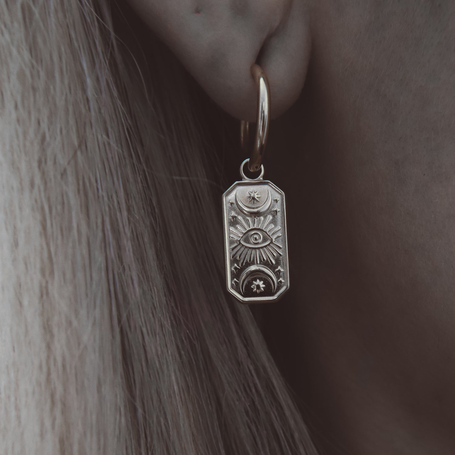 A luminous nod to ancient protection symbols, these earrings feature the Lunar Gaze Charm, a silver evil eye flanked by two crescent moons, one above and one below, mirroring the celestial rhythm of waxing and waning. The eye is a timeless emblem of protection, said to guard against negative energy and offer heightened awareness. The dual moons symbolize balance and transformation, anchoring the piece with quiet strength. Suspended from custom-sized hoops, this design merges mysticism with minimalism for an effortless, meaningful adornment.