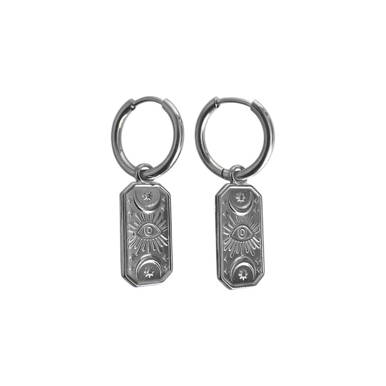 LUNAR GAZE Evil Eye Dangle Charm Hoop Earrings Silver