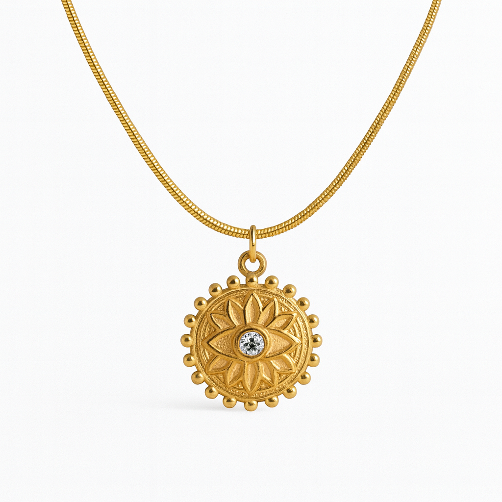 This piece features an intricately designed eye charm, meticulously crafted from durable pvd gold plated stainless steel, symbolizing protection and insight.