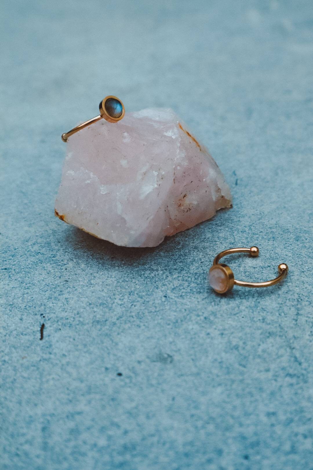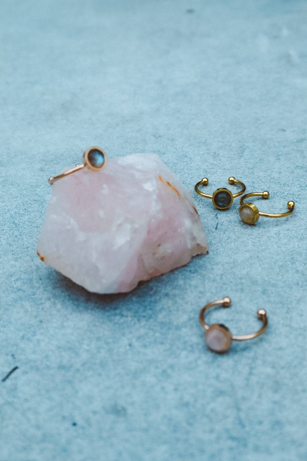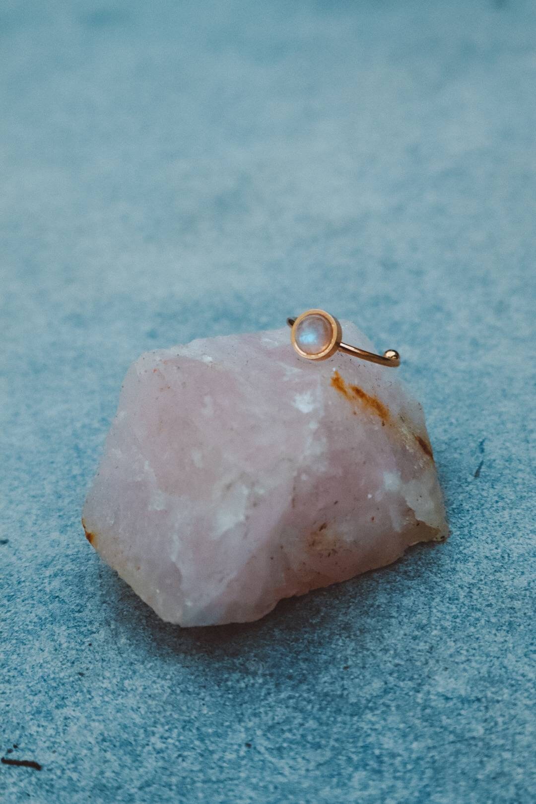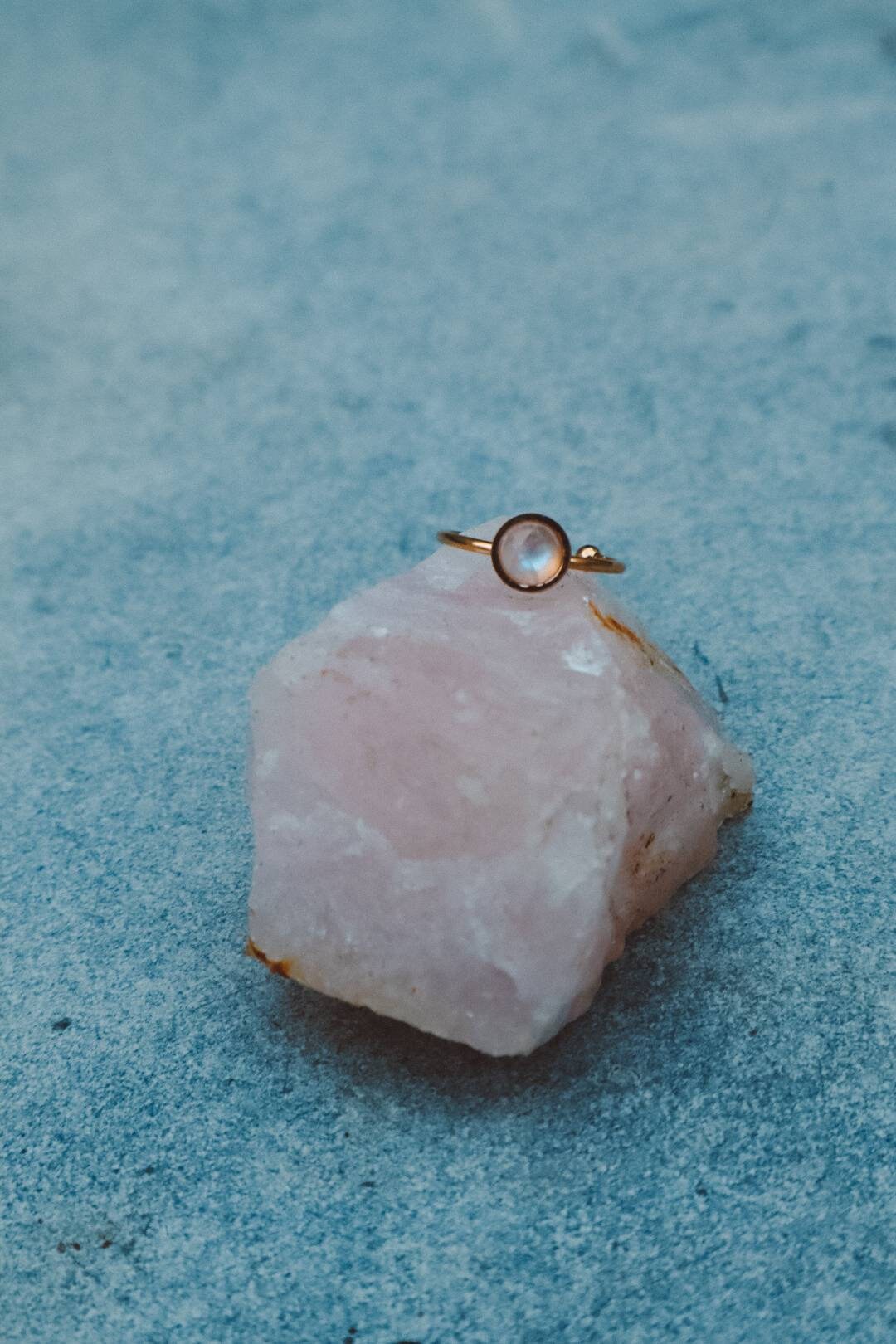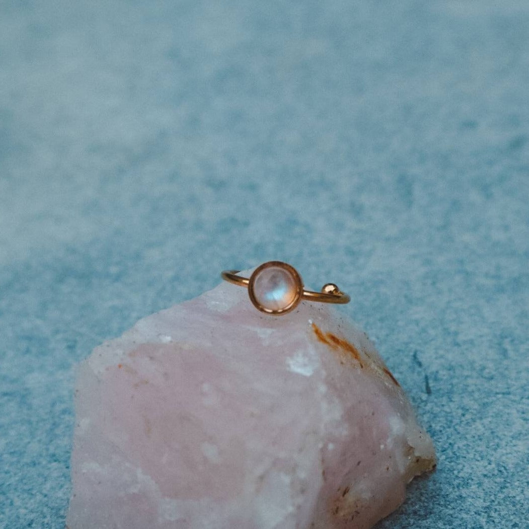 A dainty crystal ring made of rose gold stainless steel with an adjustable band. The ring features a round polished rainbow moonstone crystal in AAA quality of 6mm in diameter.