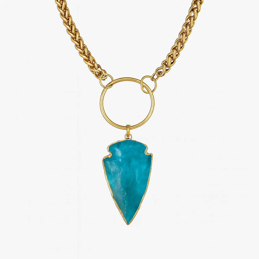 Ophira carries the shimmer of hidden depths and radiant skies, a statement of power and elegance. Its aqua aura quartz pendant glows with shifting blue iridescence, lined in 18k gold to mirror both oceanic mystery and celestial light.
