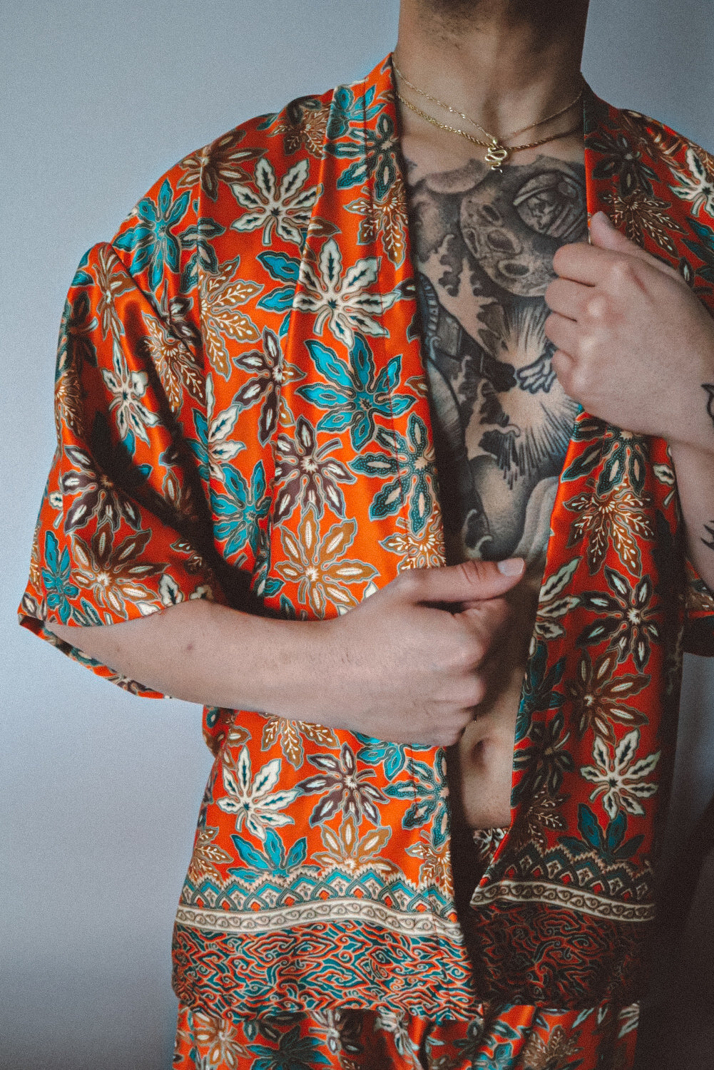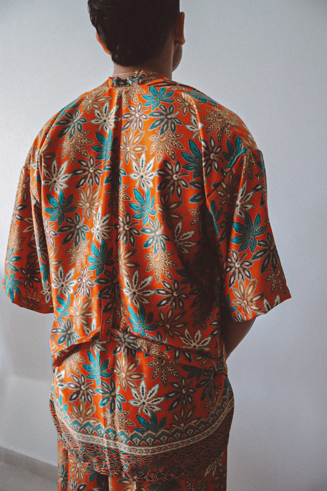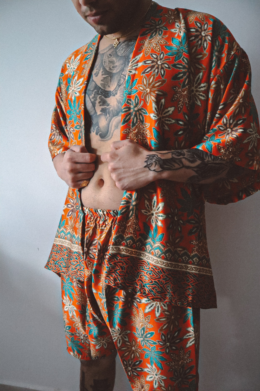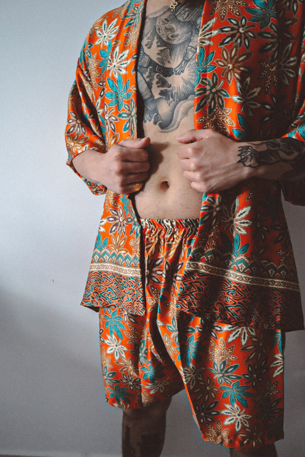 Burnt Orange Floral Silk Kimono Shorts Set Mens