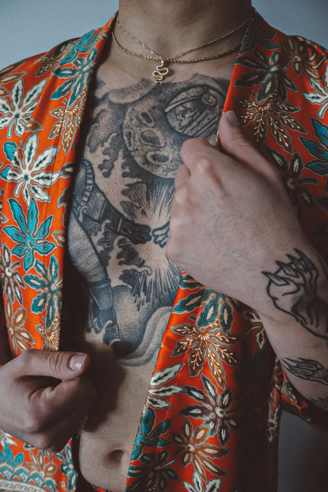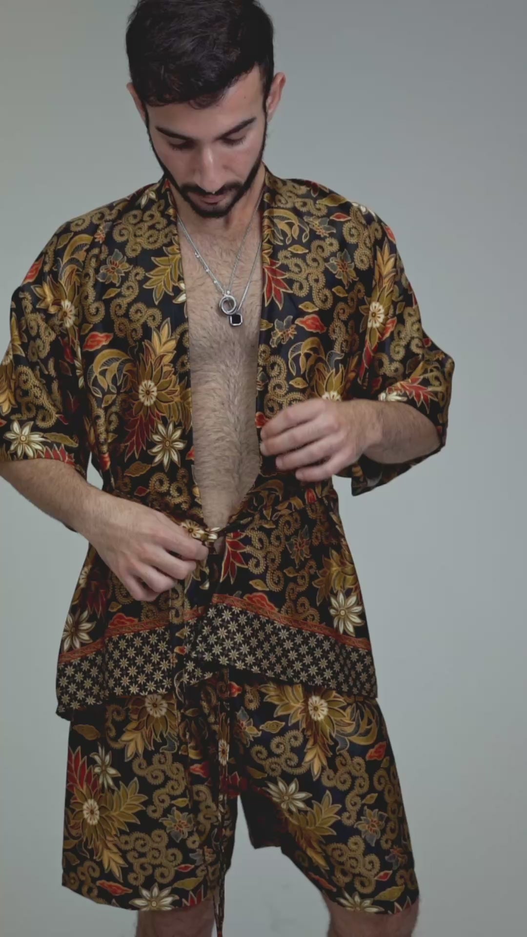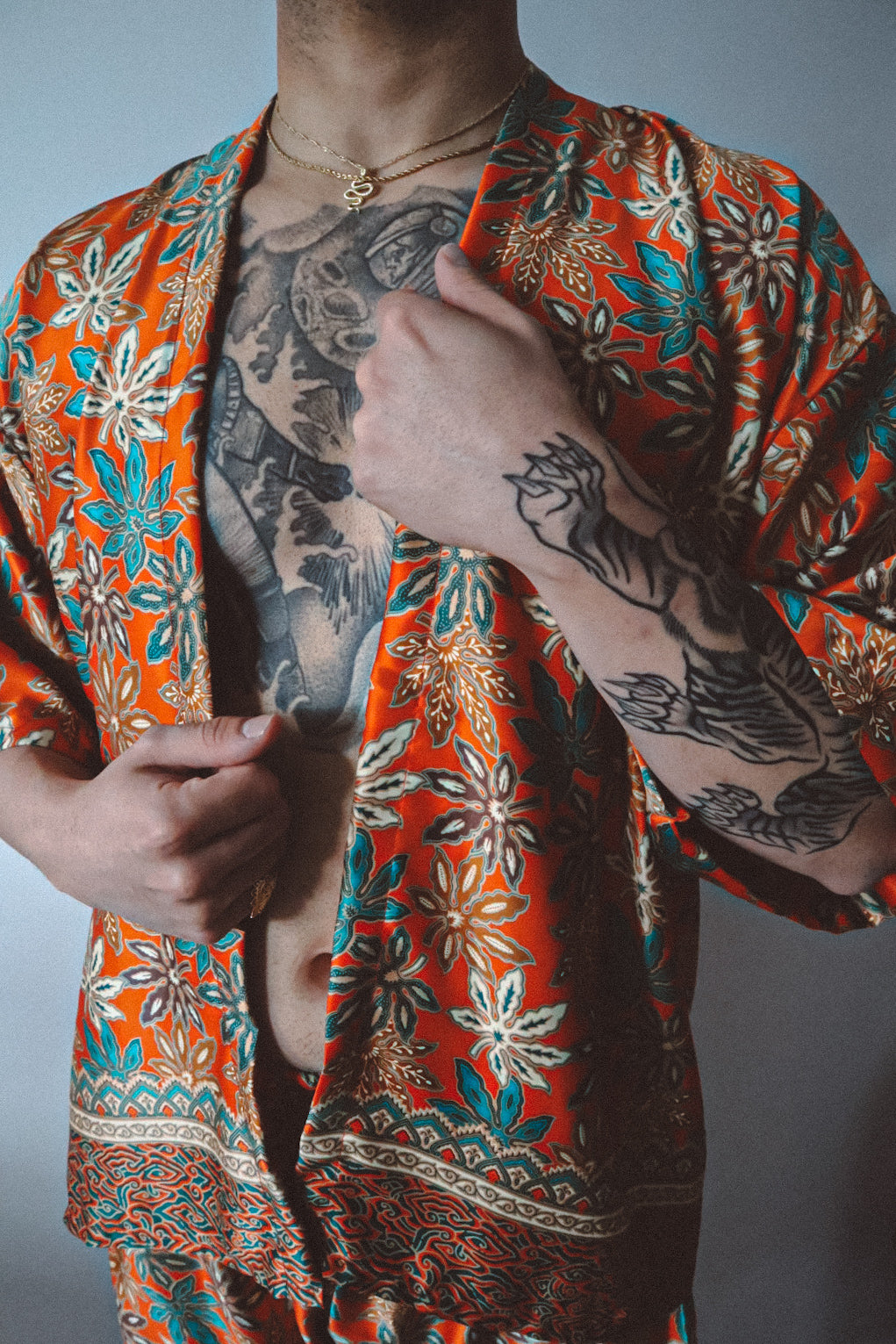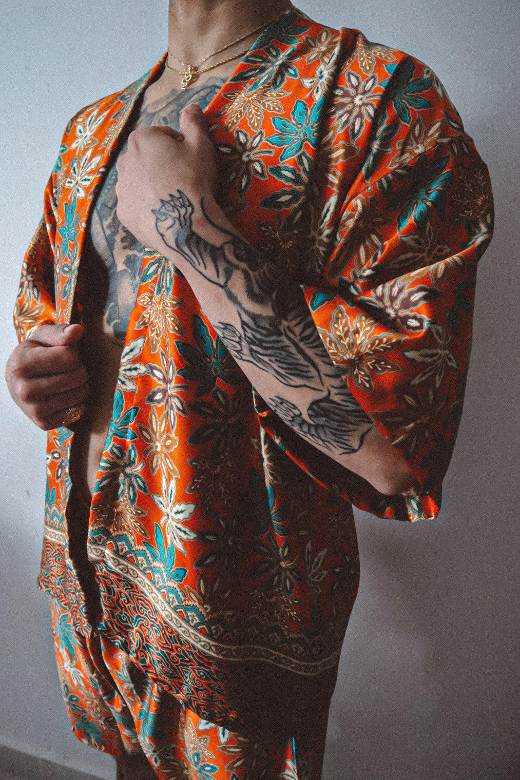 Burnt Orange Floral Silk Kimono Shorts Set Mens