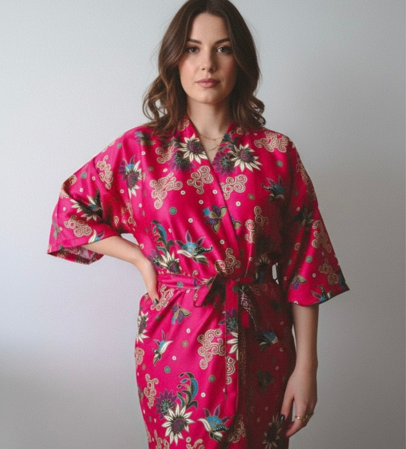 Perfect for special occasions or as an indulgent treat for yourself, this kimono is a true work of art that will elevate any outfit. So why not add a touch of feminine beauty to your wardrobe with our stunning handmade silk kimono inspired by the divine Plumeria flower?