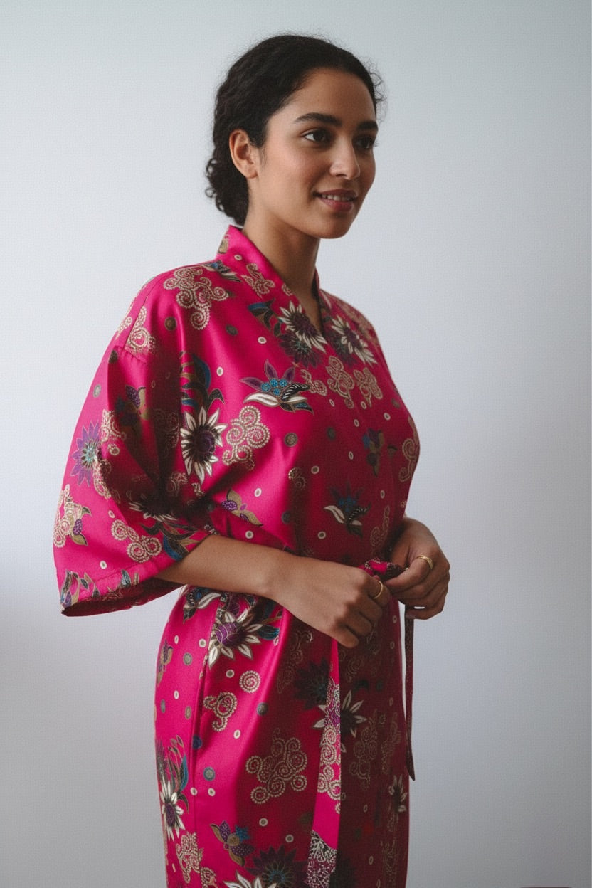 Introducing our stunning handmade silk kimono, designed with a gorgeous pink floral pattern, complemented by black and pink floral designs. This exquisite kimono is inspired by the captivating colors of the Plumeria flower, also known as the Frangipani, which holds great spiritual and cultural significance.