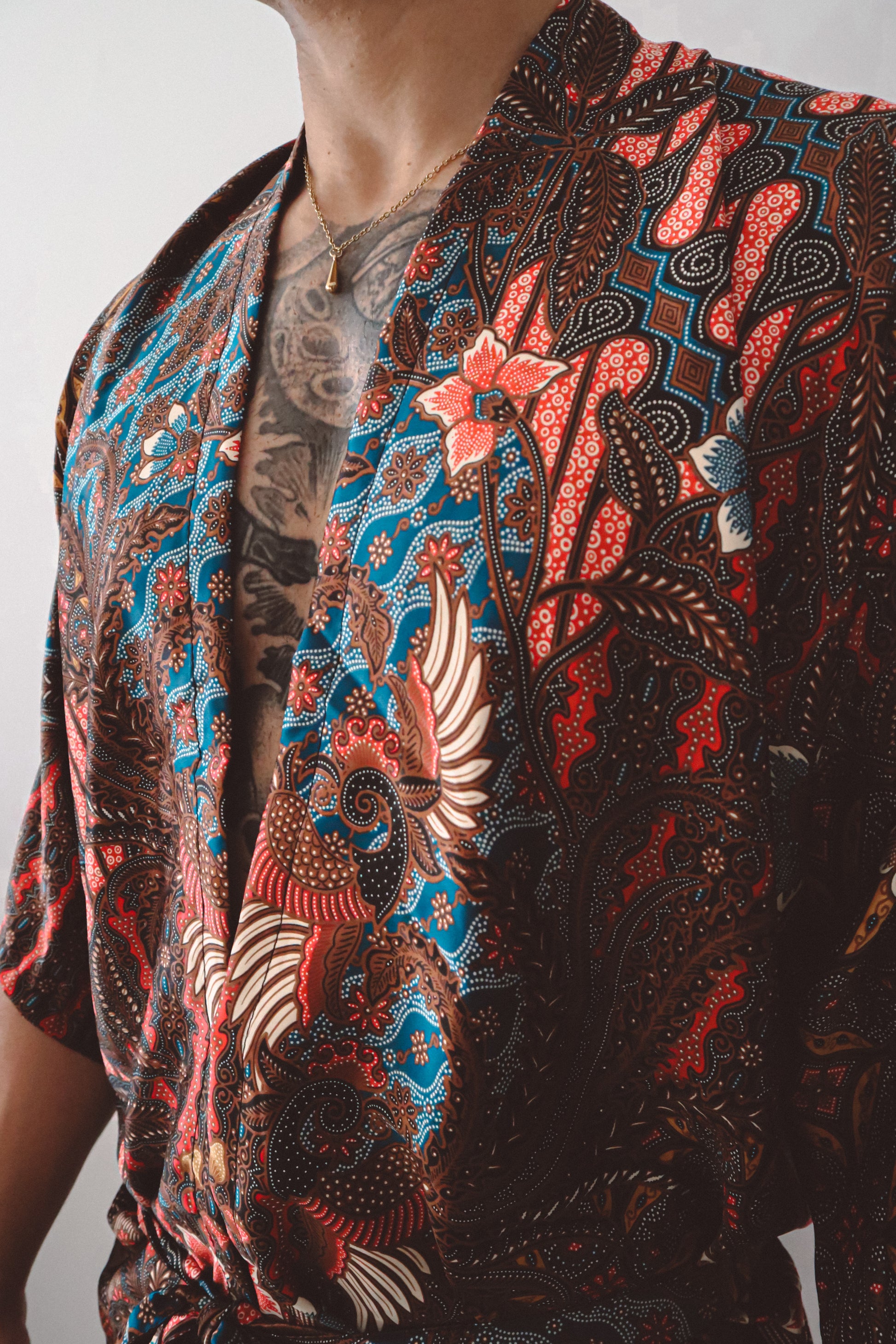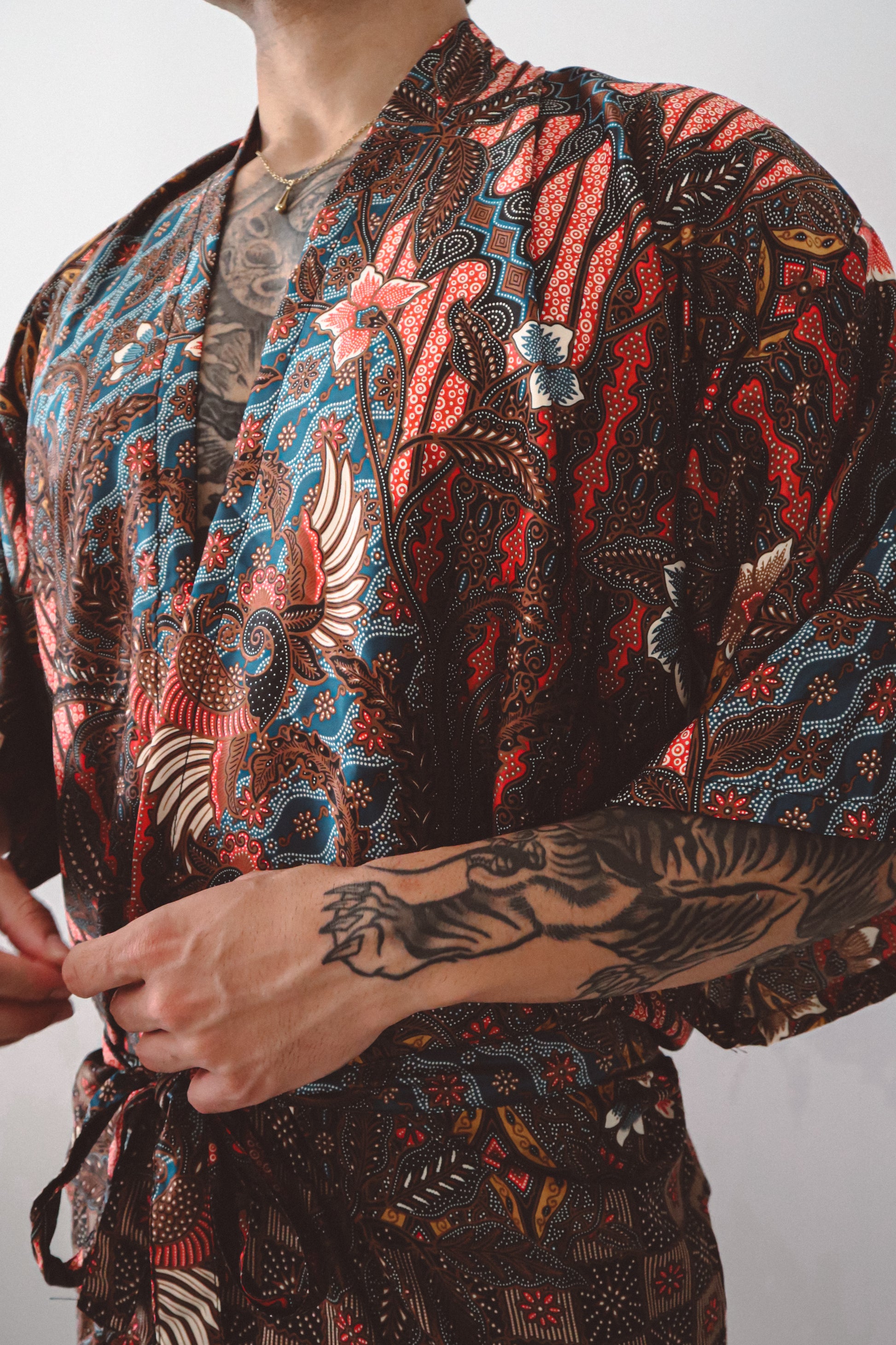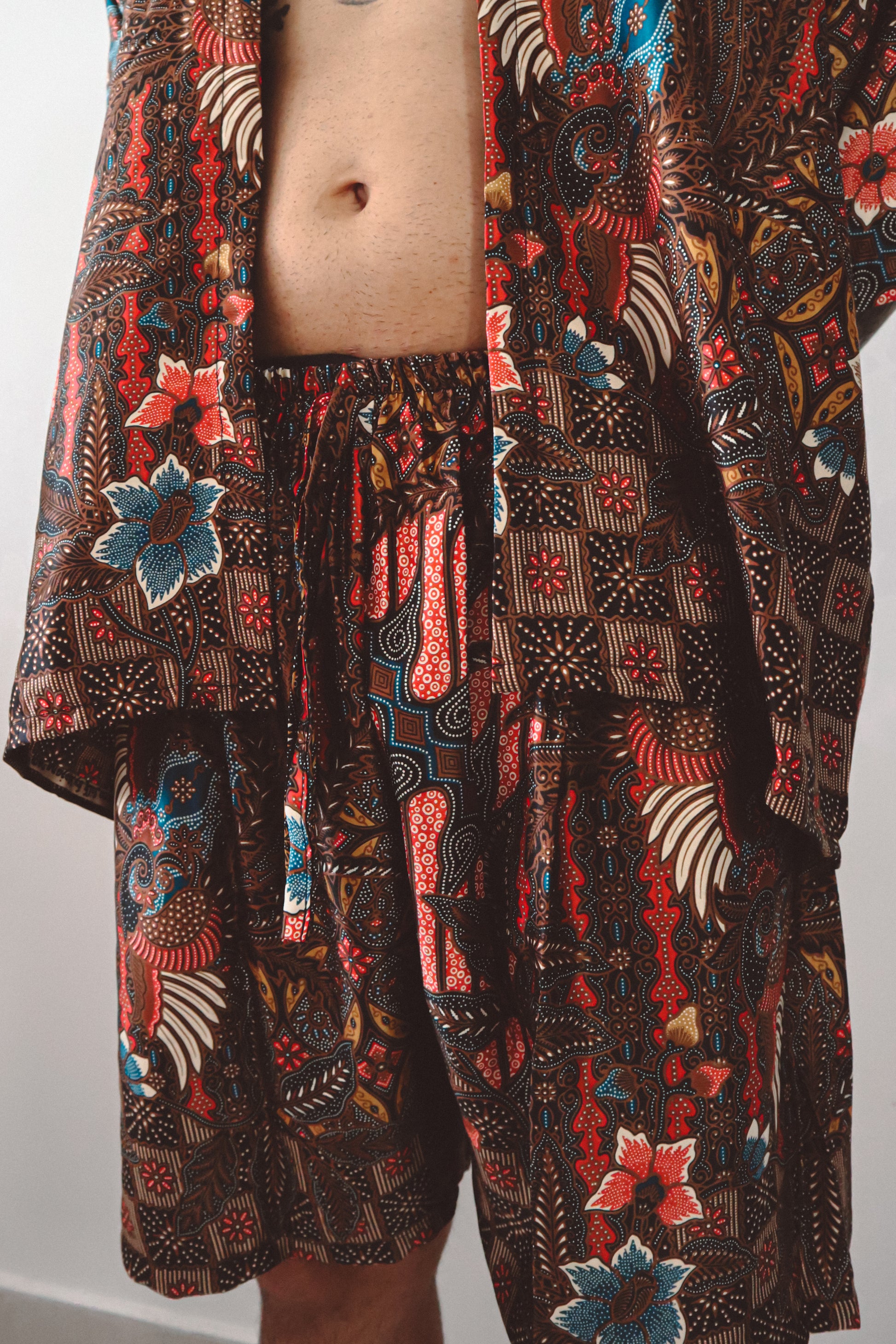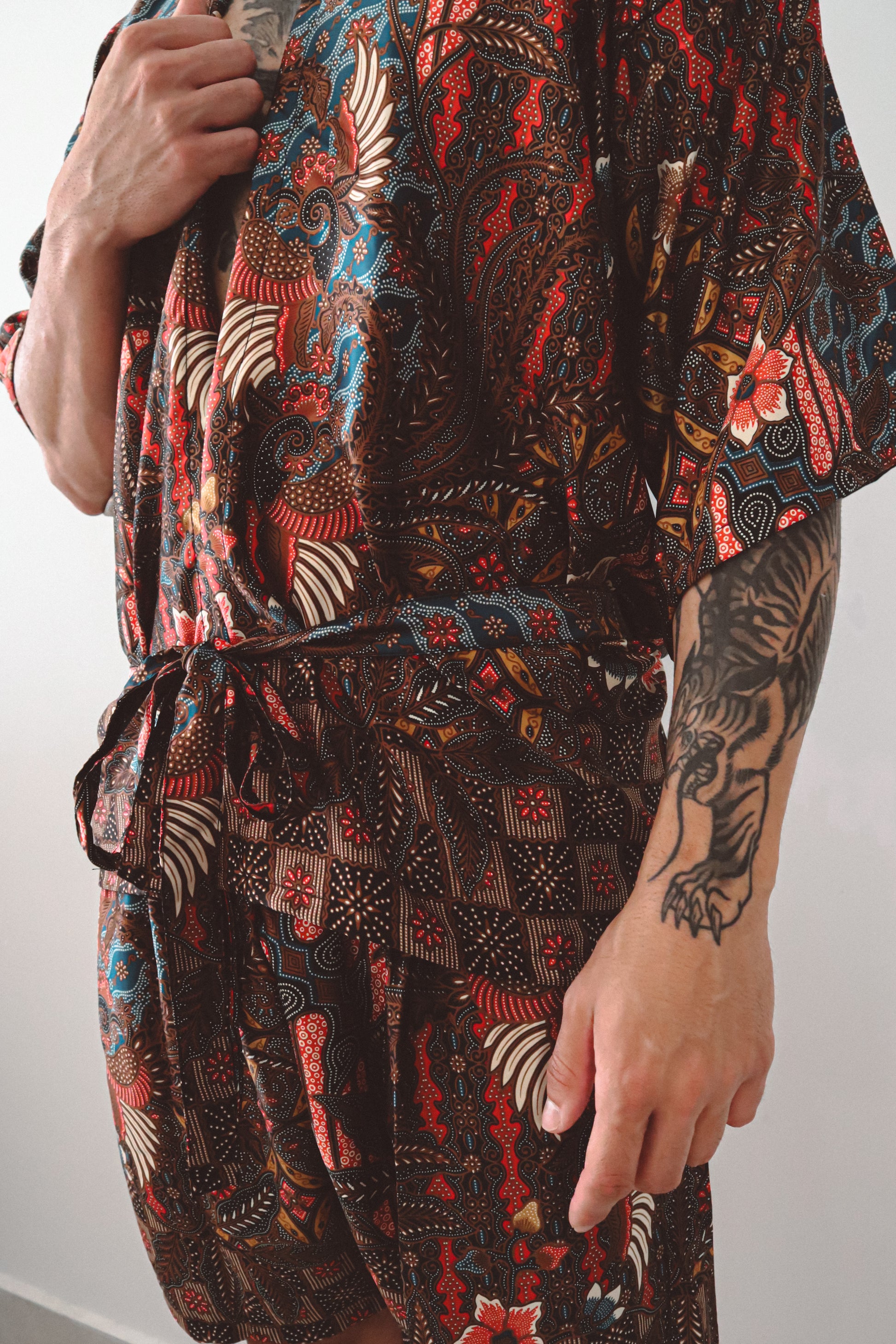 Where fire meets tranquility, this handmade kimono and shorts set captures the duality of boldness and calm. A deep black silk canvas becomes the backdrop for a vivid bloom of red and blue florals—an evocative pairing symbolizing strength, passion, and inner clarity.