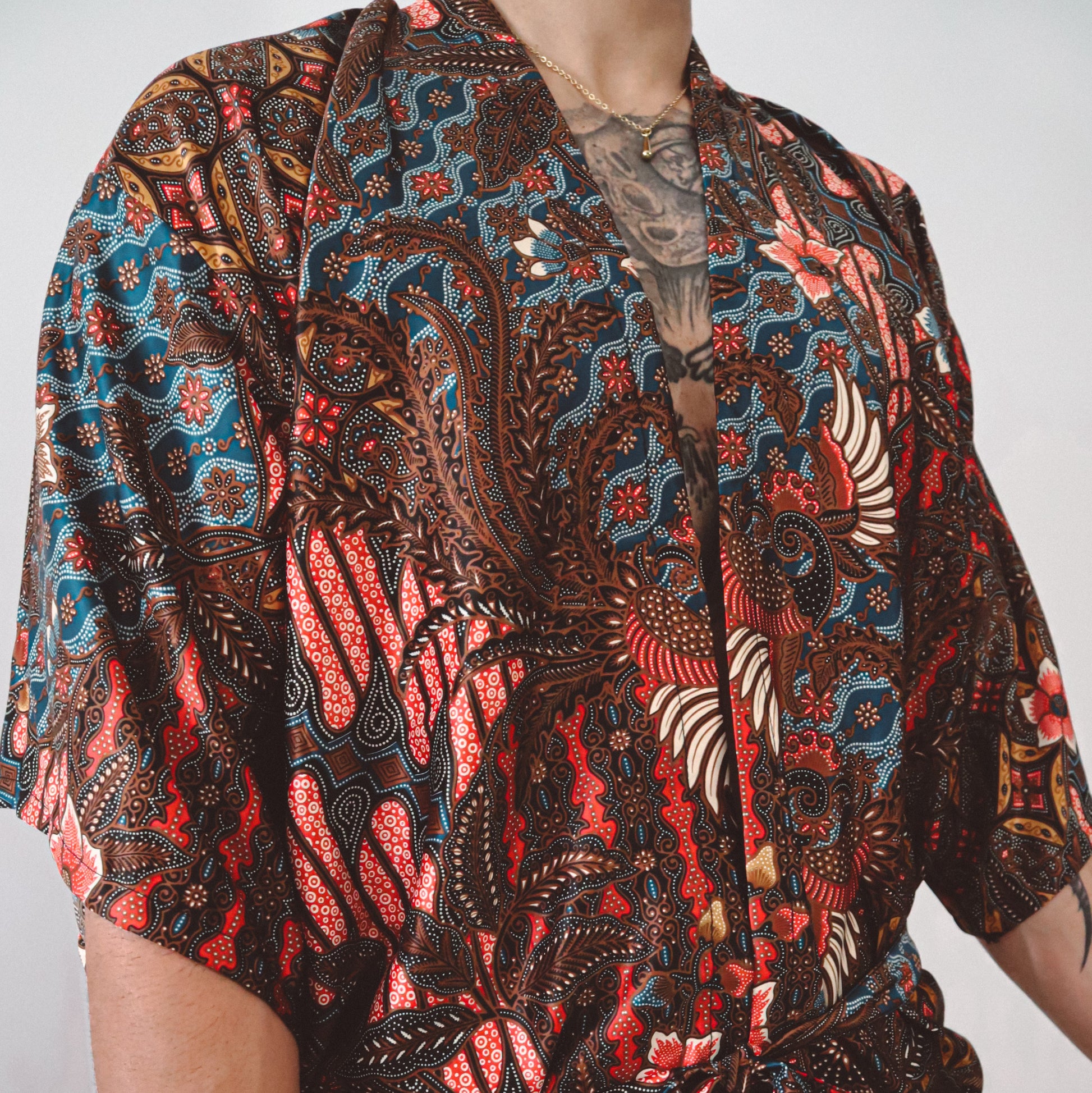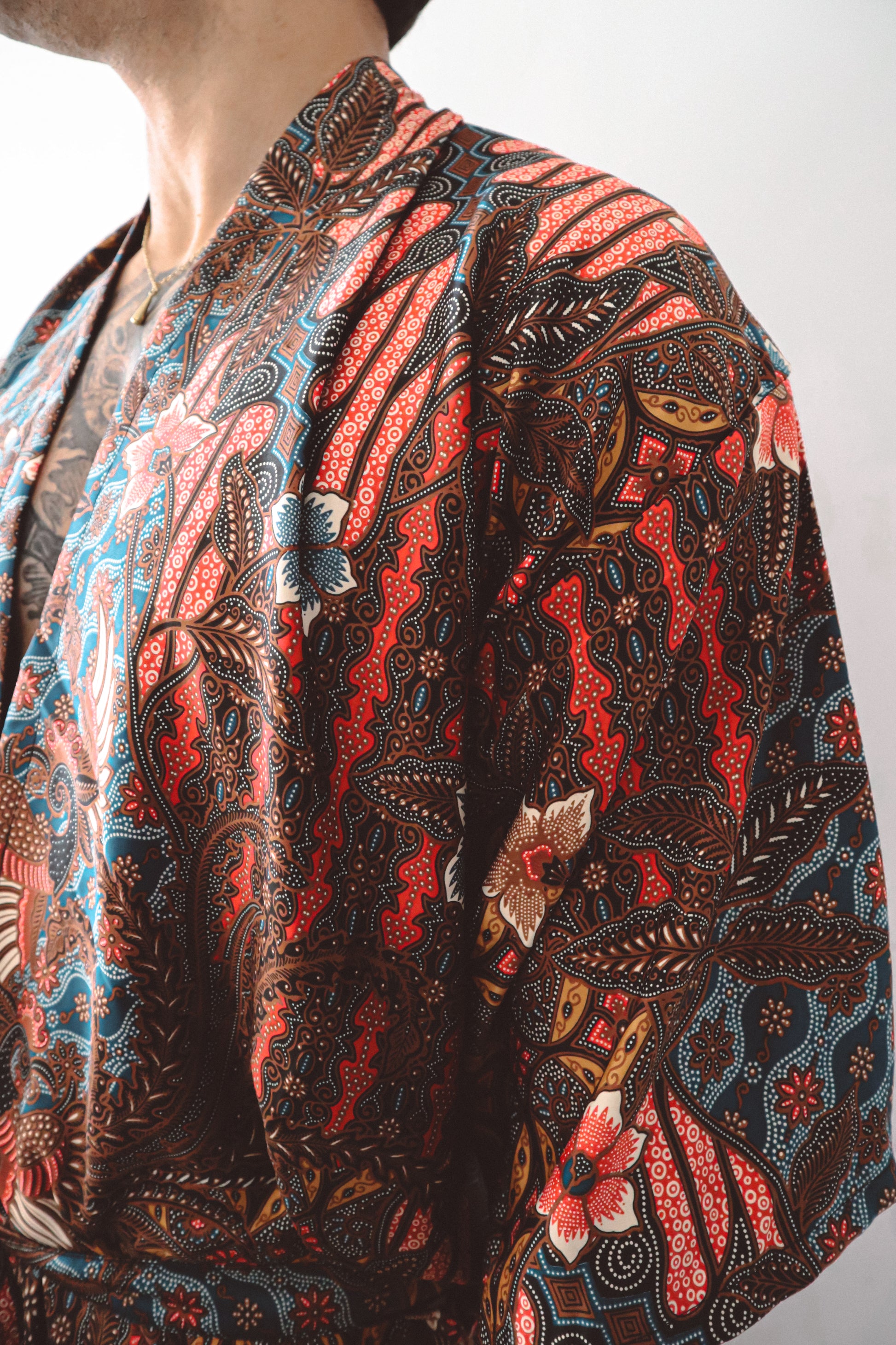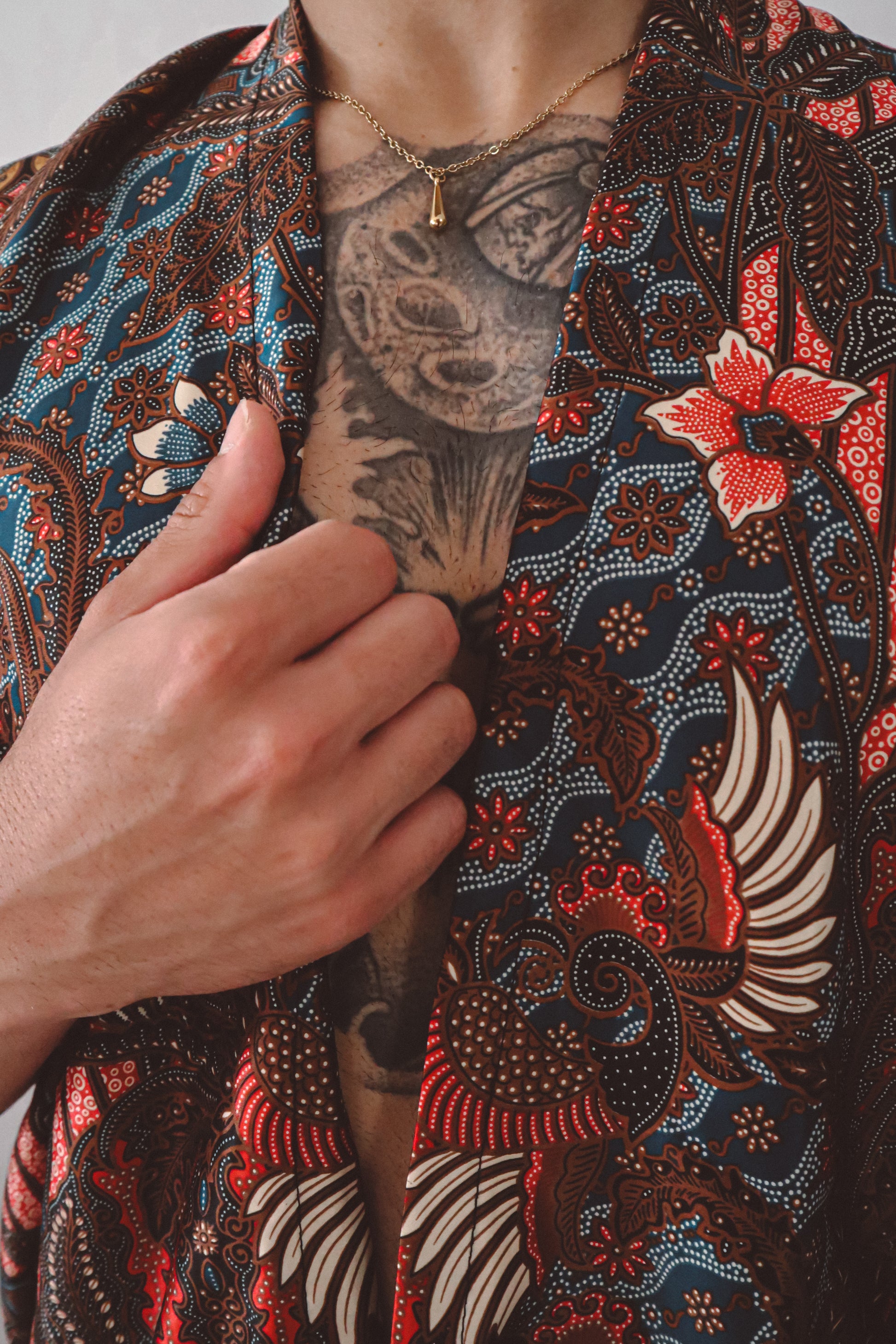 Where fire meets tranquility, this handmade kimono and shorts set captures the duality of boldness and calm. A deep black silk canvas becomes the backdrop for a vivid bloom of red and blue florals—an evocative pairing symbolizing strength, passion, and inner clarity.