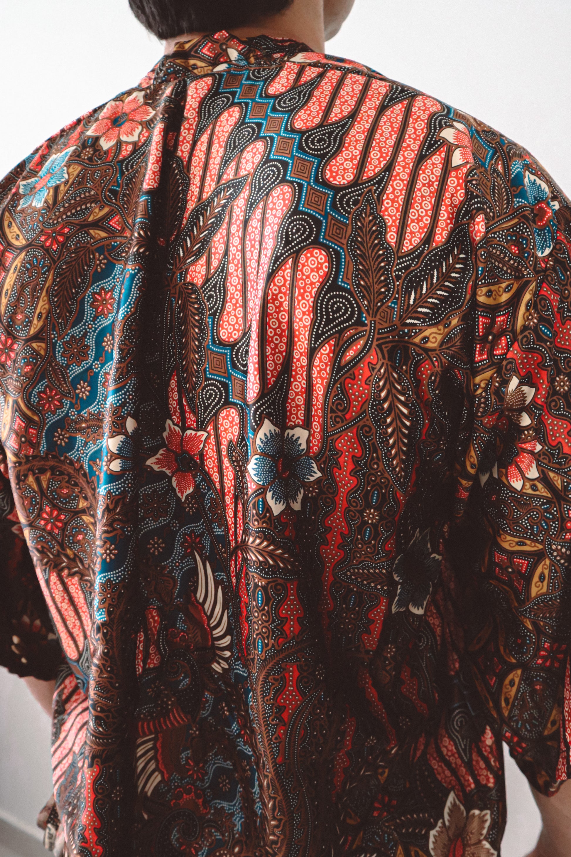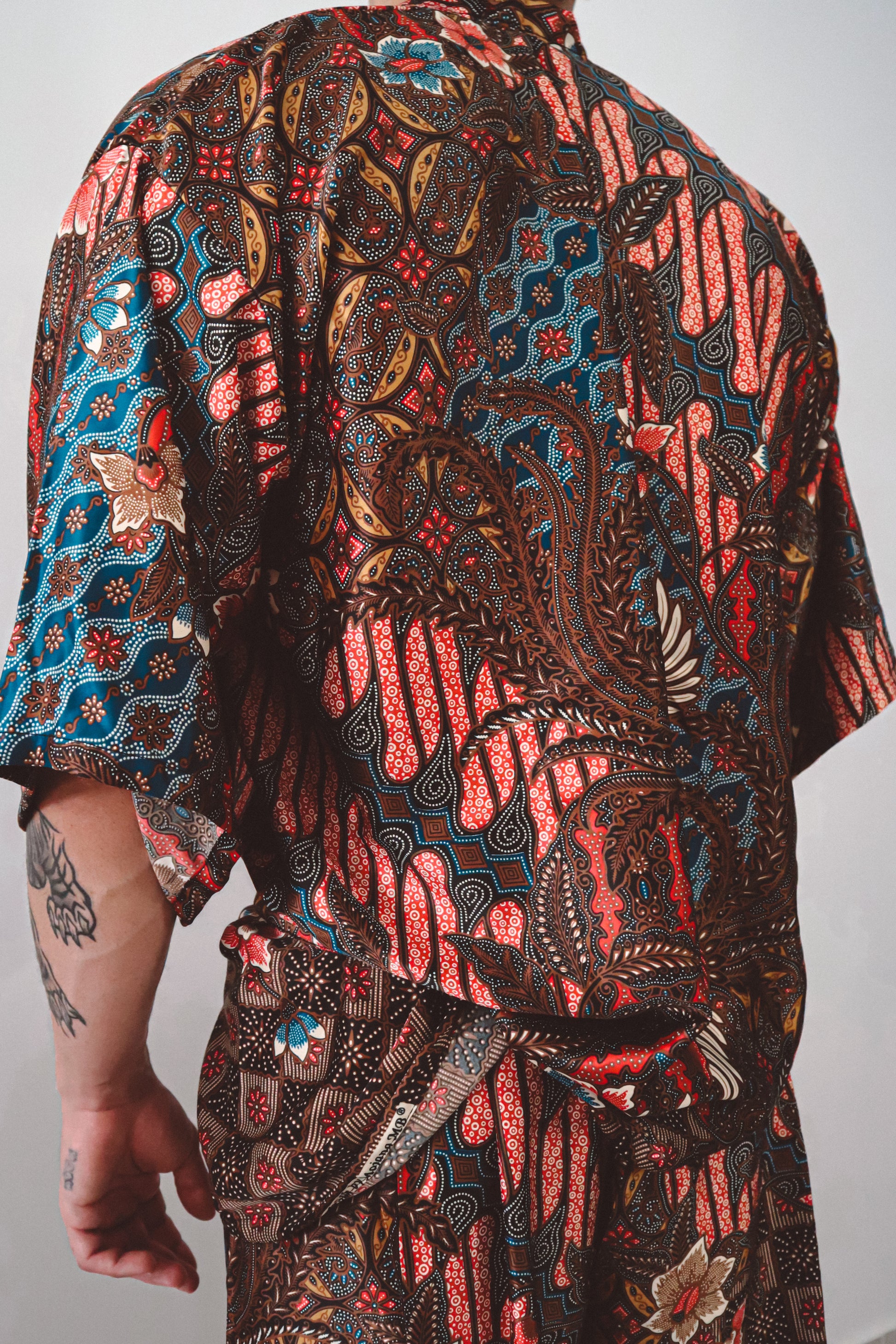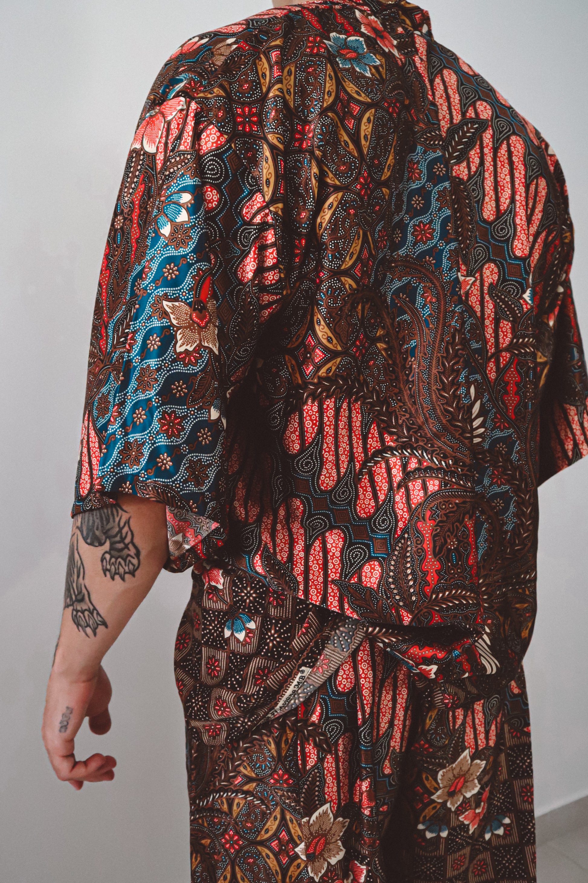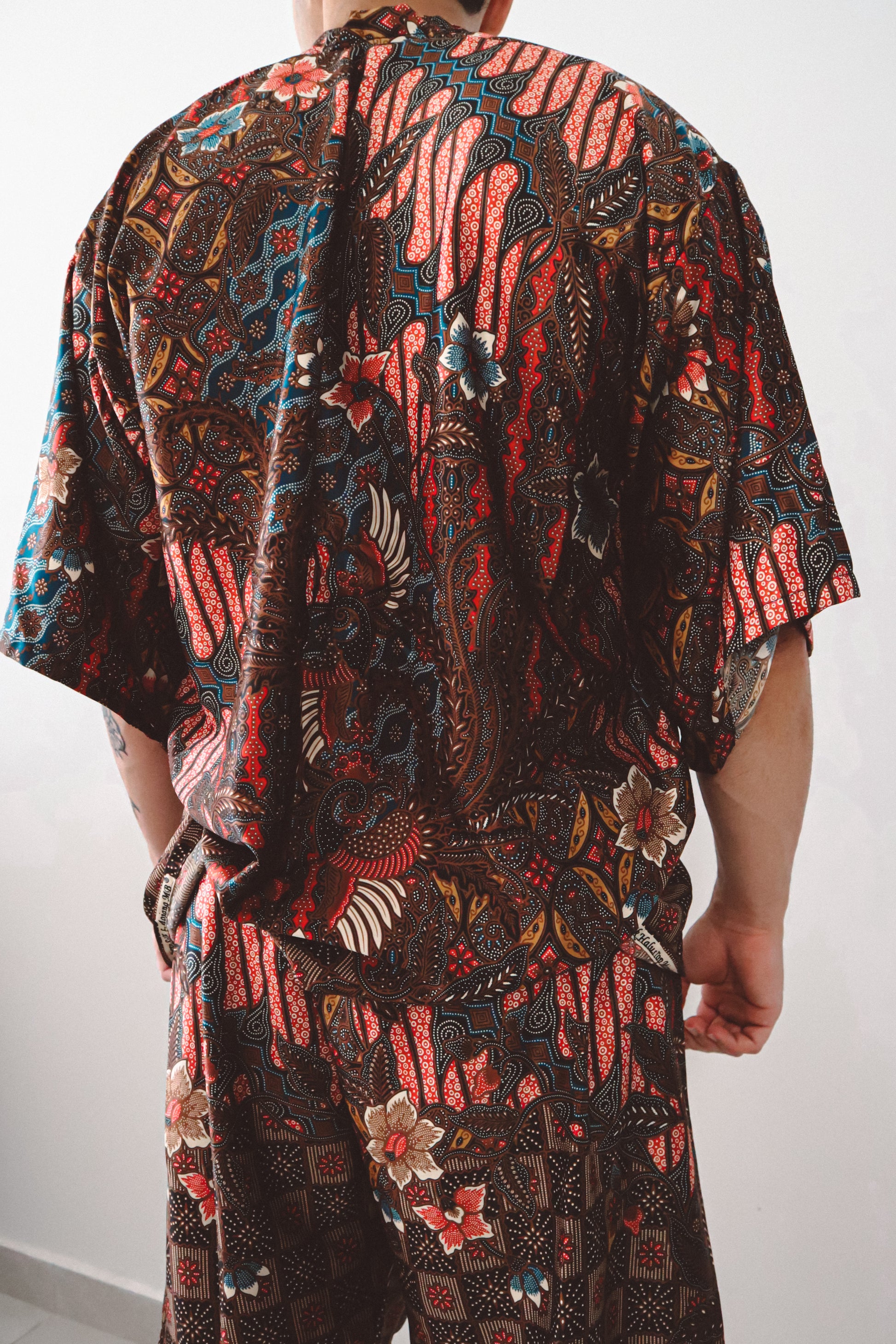 Where fire meets tranquility, this handmade kimono and shorts set captures the duality of boldness and calm. A deep black silk canvas becomes the backdrop for a vivid bloom of red and blue florals—an evocative pairing symbolizing strength, passion, and inner clarity.