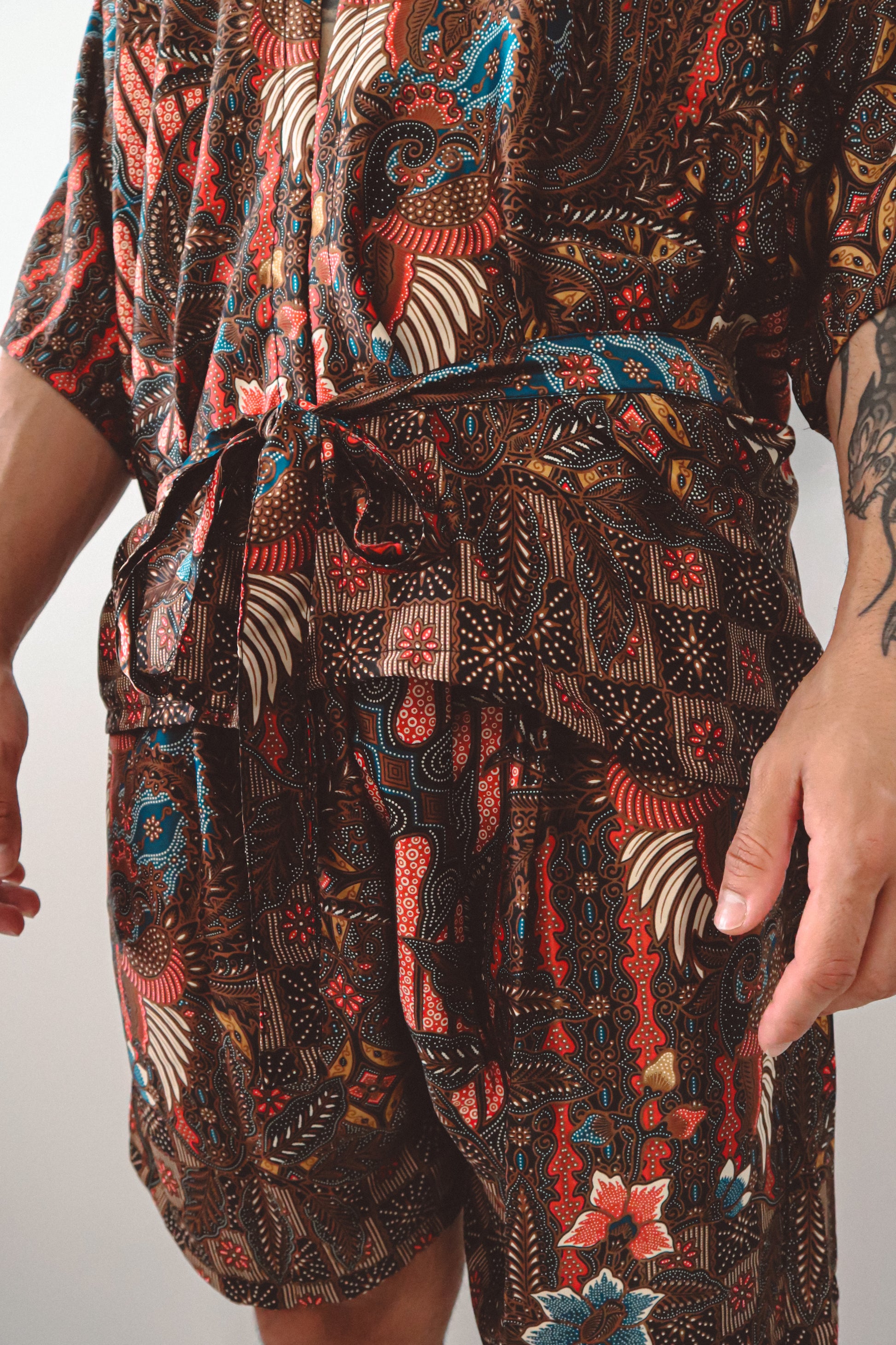 The open-style kimono drapes gracefully, anchored by a matching silk tie for customizable styling. The relaxed-fit, wide-leg shorts echo the same visual rhythm, creating a cohesive look that flows from sunrise festivals to meditative evenings. Inspired by the dual nature of the lotus—rooted in stillness, yet reaching upward—this set channels both power and poise.
