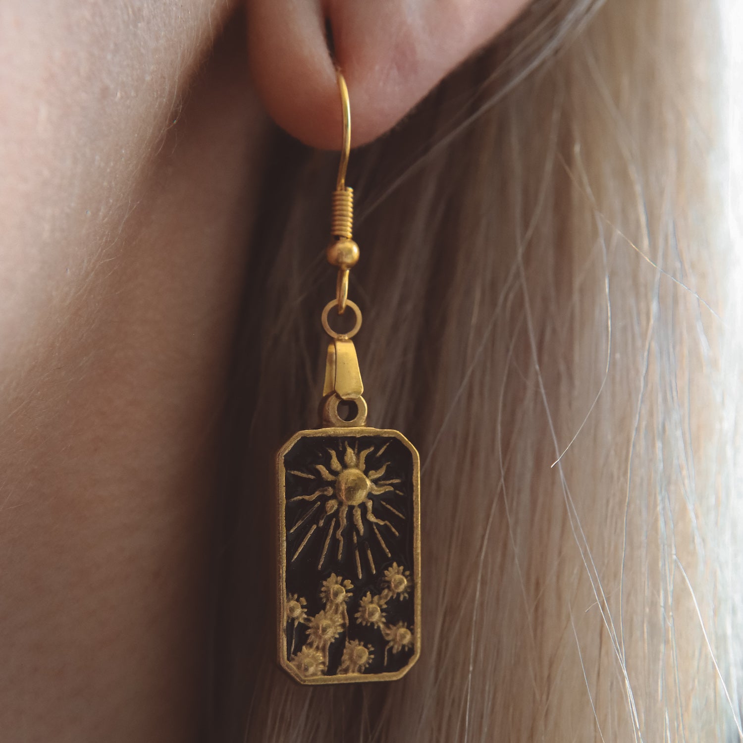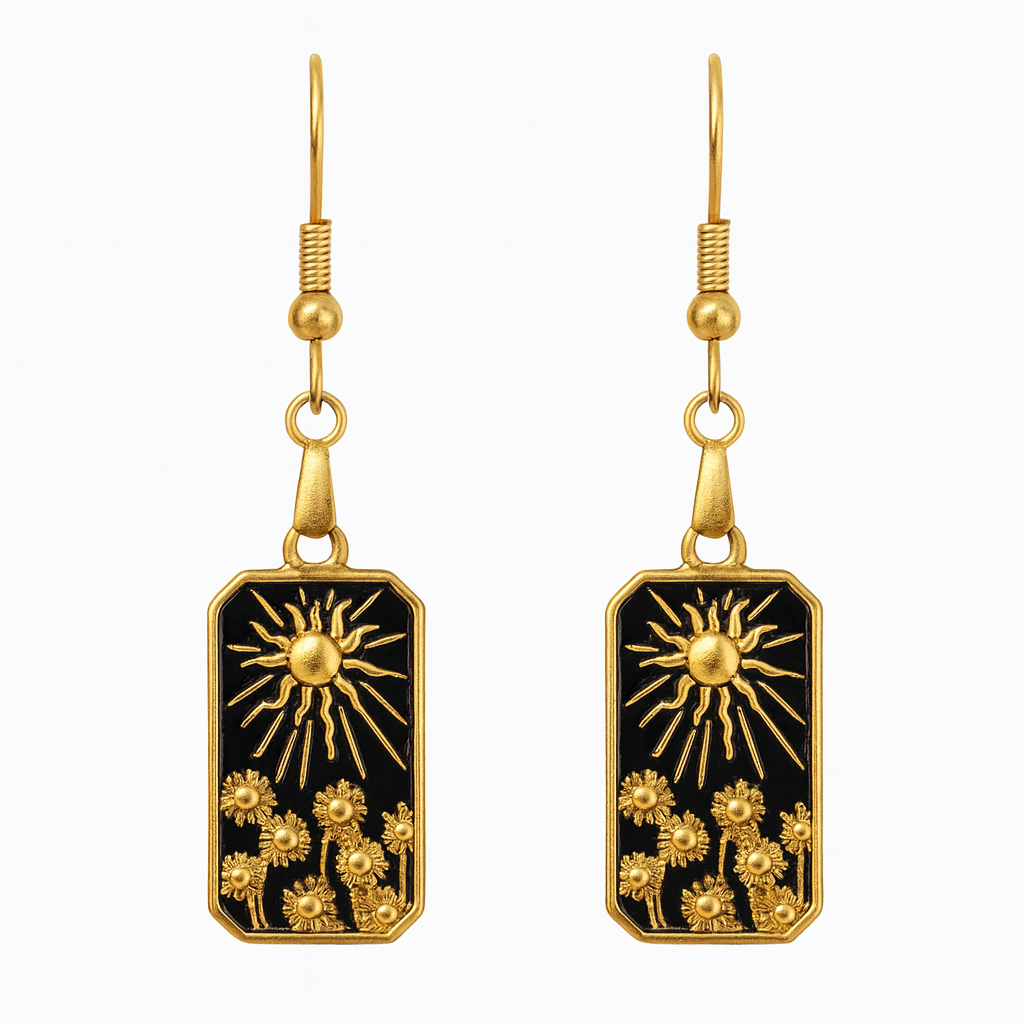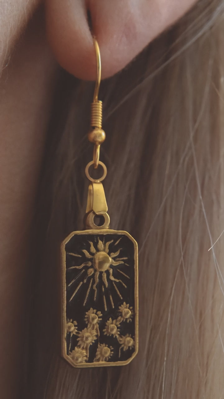 Infused with solar energy and botanical symbolism, these dangling earrings feature a radiant gold sun and blooming sunflower set against a glossy black enamel background. The rectangular charm evokes the look of a miniature tarot card—an emblem of light, clarity, and growth.