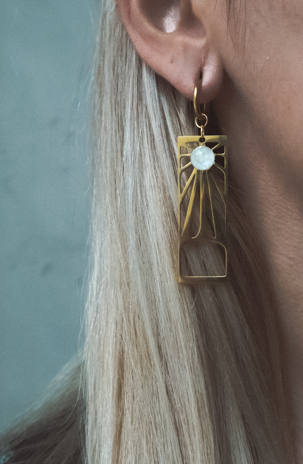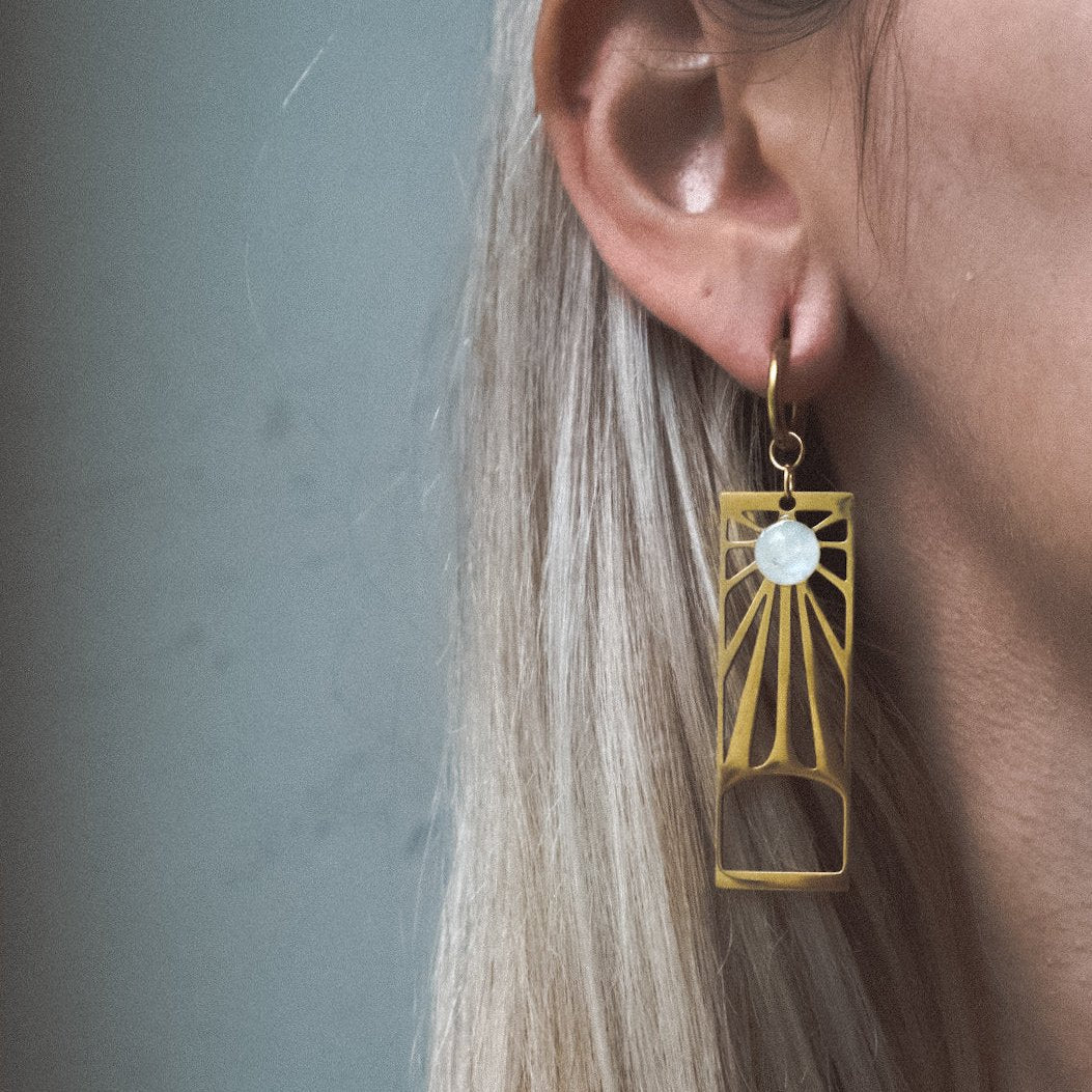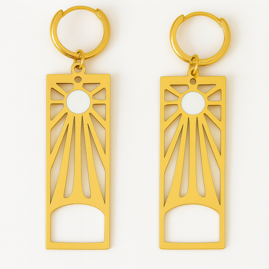 Sunrise glows with golden light, embodying the quiet power of dawn as it spills warmth across the horizon. At its center rests a smooth white enamel sun, radiant in its simplicity—capturing purity, clarity, and the promise of new beginnings. Dangling from polished gold hoops, this design brings together elegance and symbolic strength in a timeless form.