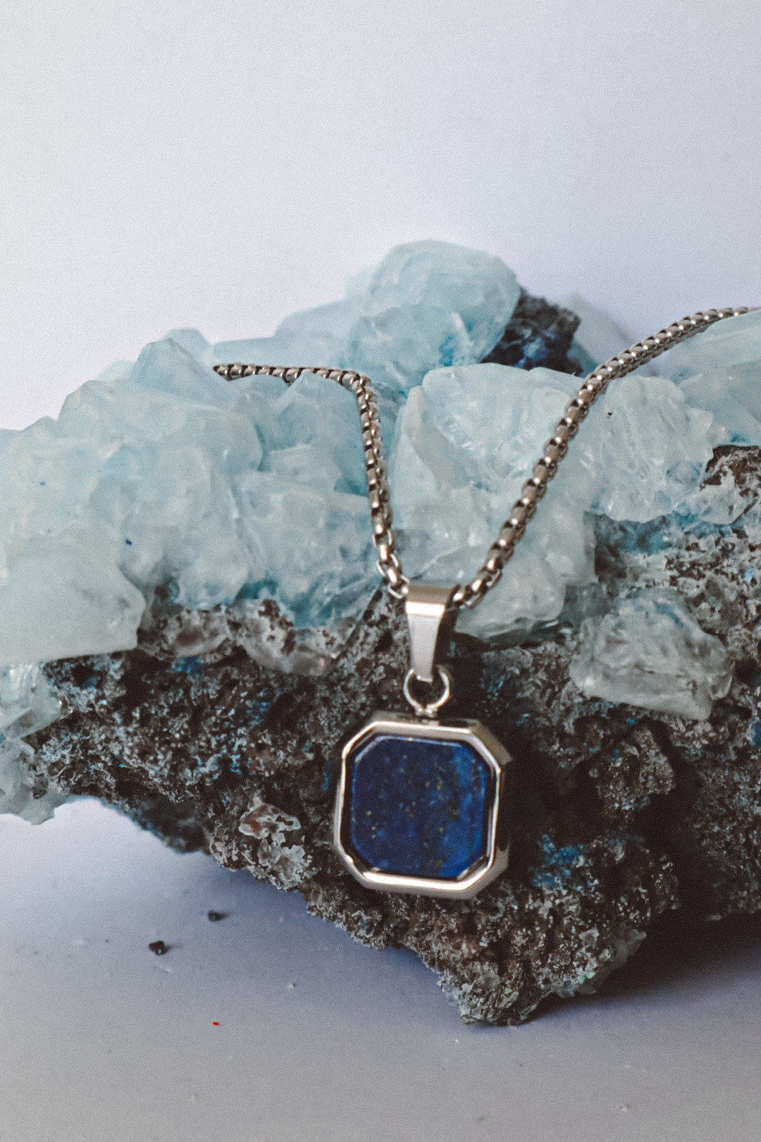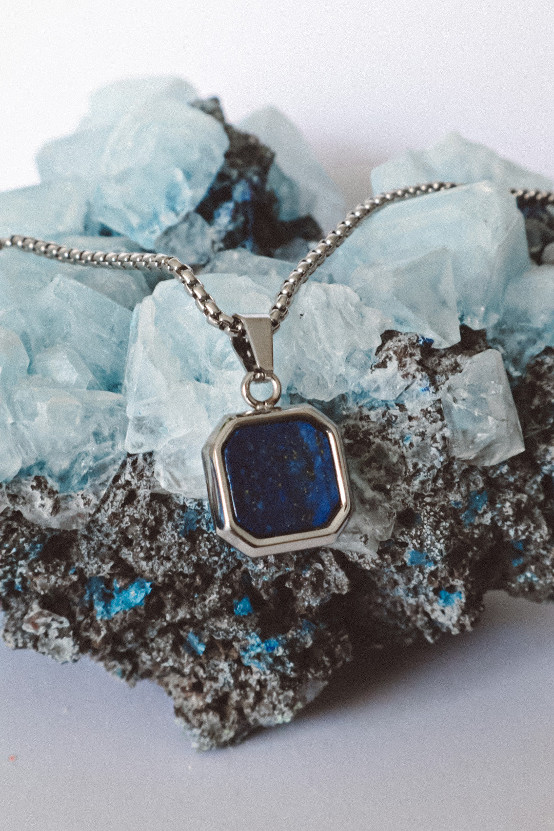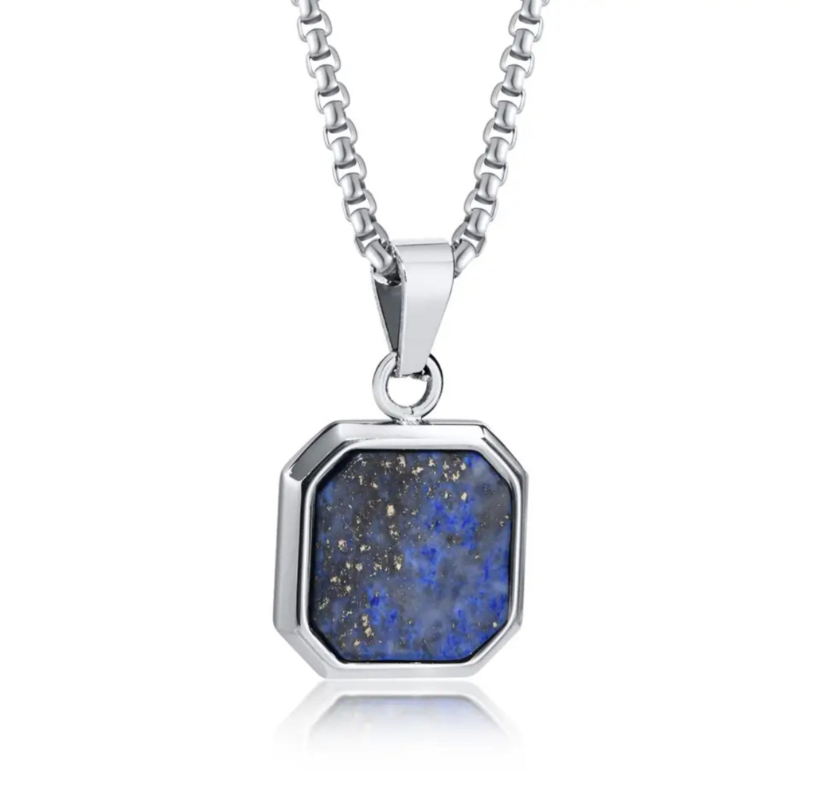 The Urban Edge Pendant Necklace embodies strength and sophistication in a modern design. A square stainless steel pendant houses a polished lapis lazuli gemstone, glowing with celestial blue tones and golden flecks that speak of wisdom, truth, and clarity. Each stone is unique, reflecting individuality and depth.