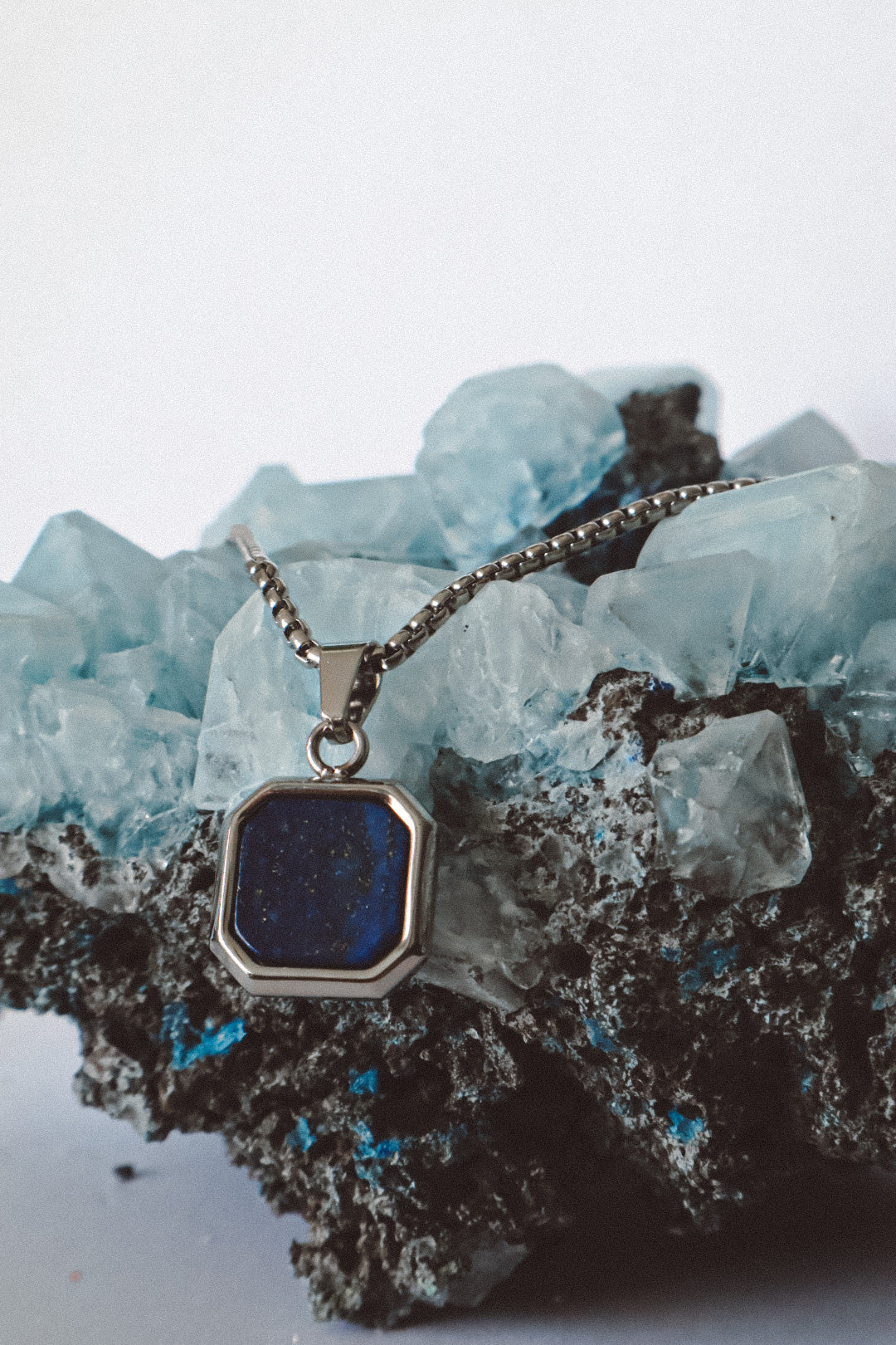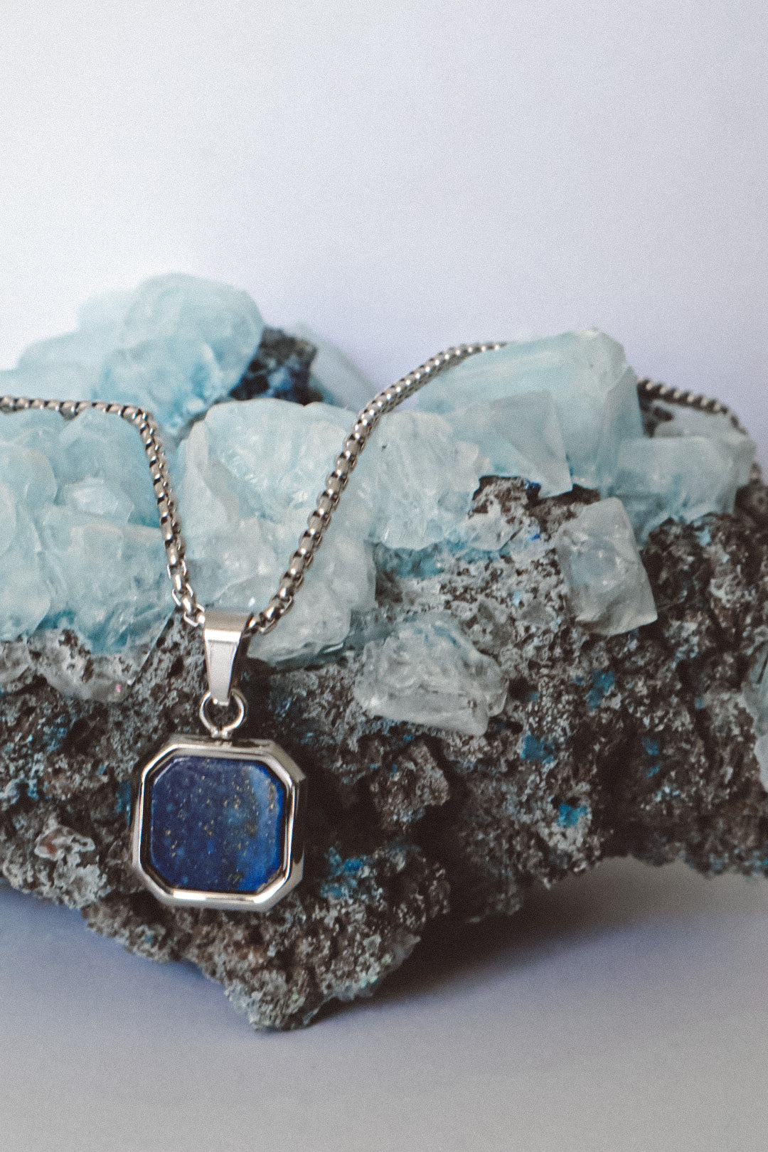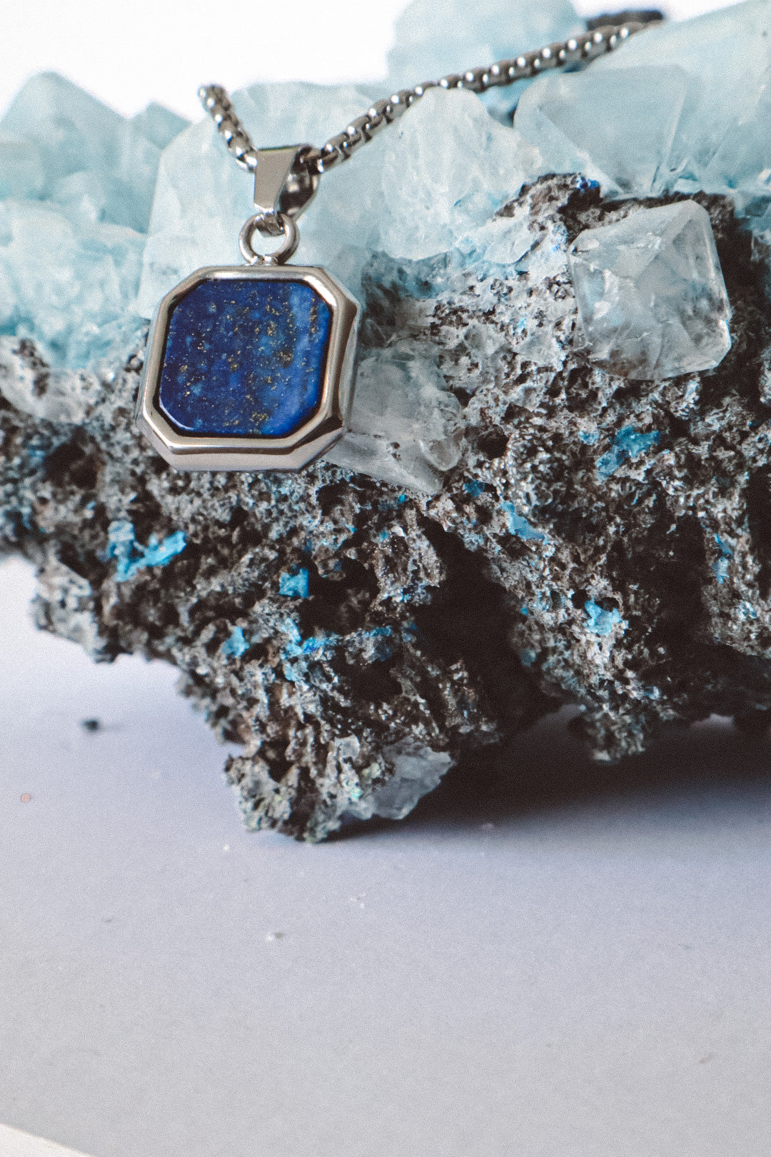The Urban Edge Pendant Necklace embodies strength and sophistication in a modern design. A square stainless steel pendant houses a polished lapis lazuli gemstone, glowing with celestial blue tones and golden flecks that speak of wisdom, truth, and clarity. Each stone is unique, reflecting individuality and depth.