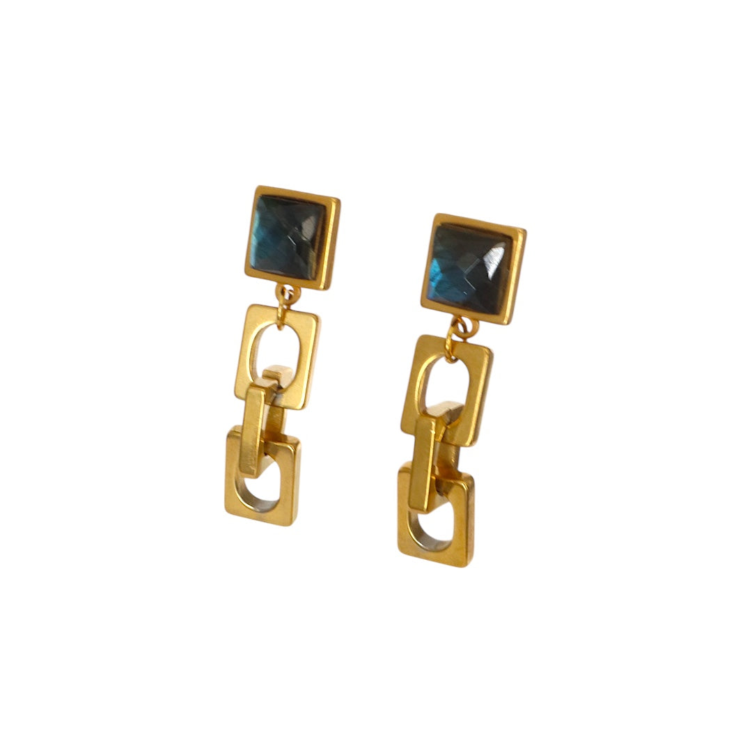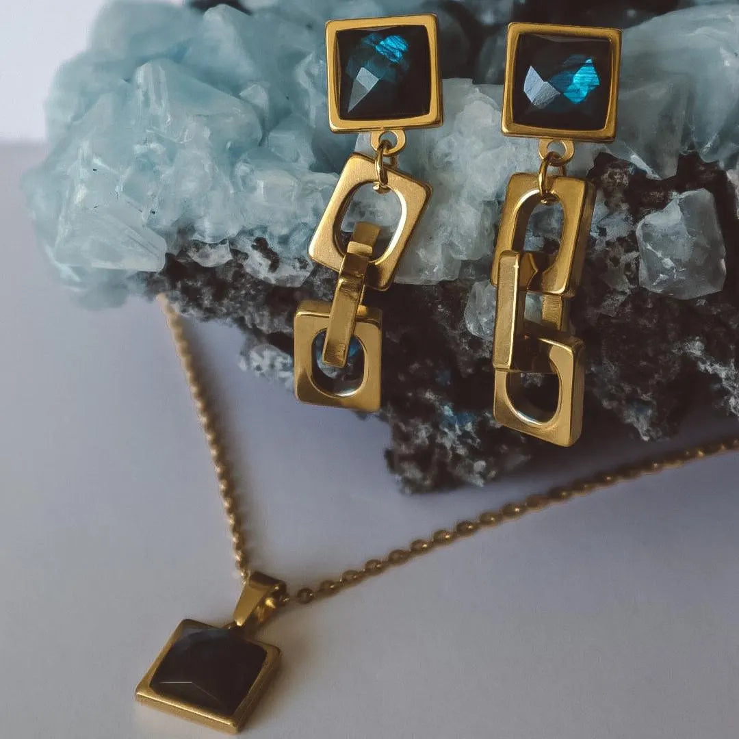 Light-catching and soul-stirring, these handcrafted earrings feature AAA-grade blue labradorite—known for its iridescent flashes and shape-shifting hues. Cut into elegant squares and set in gold stainless steel, the stones shimmer with deep blues and violets, symbolizing transformation, protection, and awakened intuition. Their modern geometric silhouette and mystical aura make them perfect for dreamers, creatives, and seekers of inner truth. Handmade in our home studio, each pair carries a quiet power and cosmic edge.