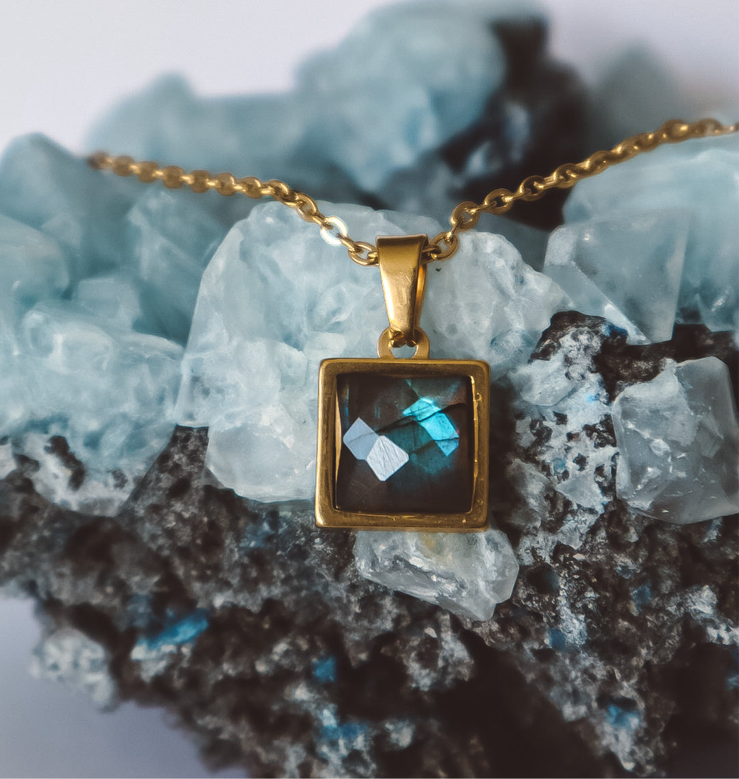 The VARG Blue Labradorite Faceted Square Pendant Necklace showcases a natural blue labradorite stone, admired for its enchanting iridescence and vibrant blue hues. Set in a chic square pendant with 18k gold PVD plating, this necklace adds a sophisticated glow to your look. Handmade in our home studio, the piece symbolizes protection, intuition, and personal growth. The custom-length cable chain offers a tailored fit, making it a meaningful and elegant addition to any collection.