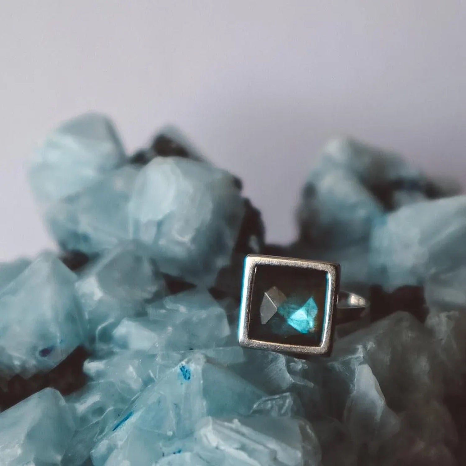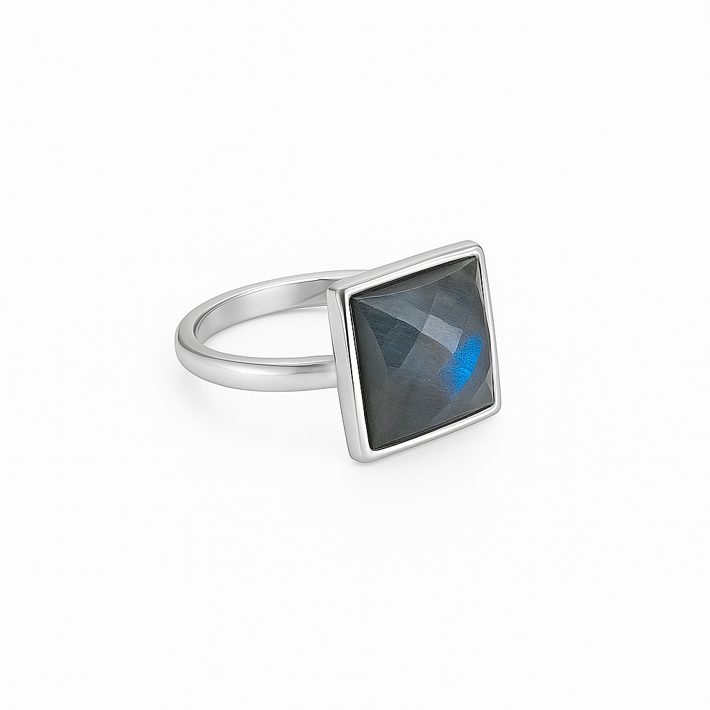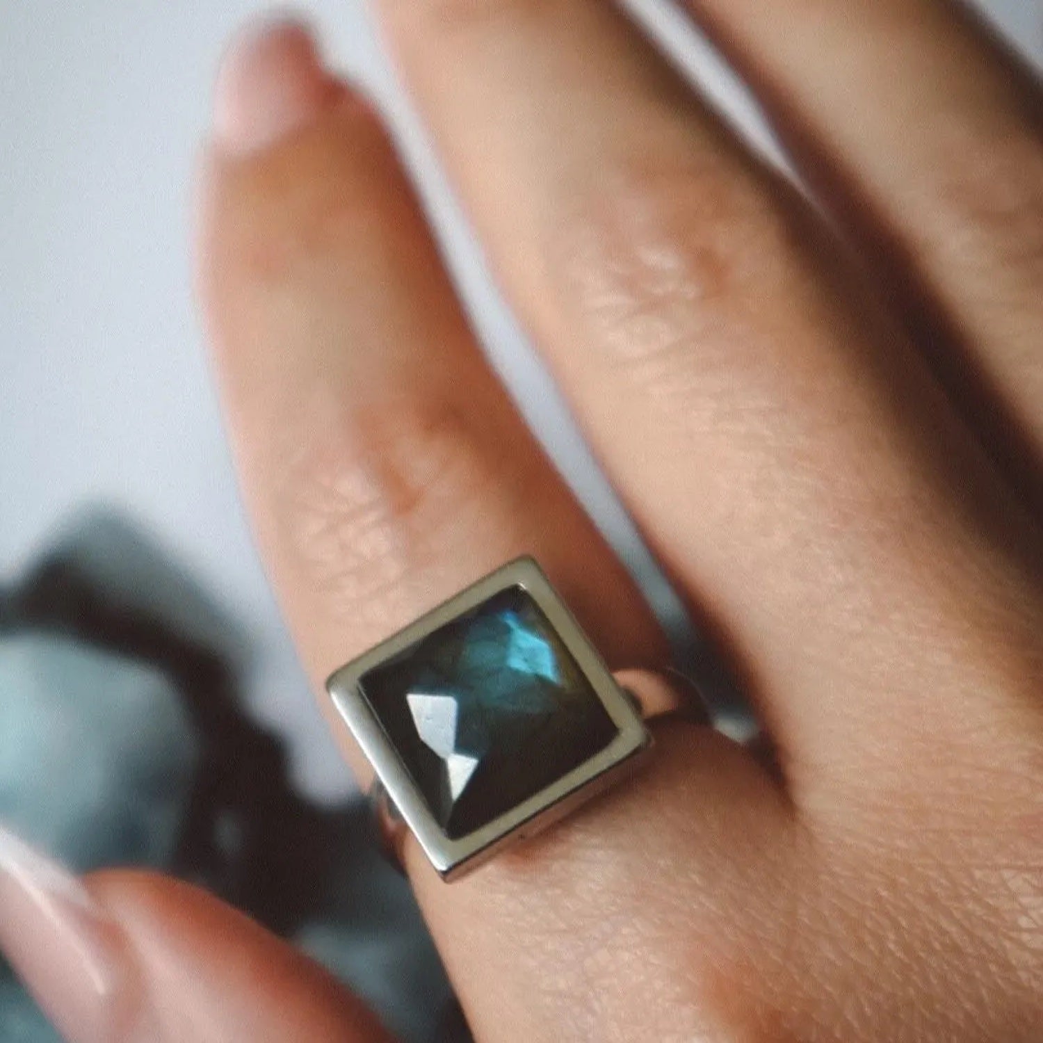Mesmerizing flashes of blue ripple across the faceted AAA labradorite gemstone, a natural stone renowned for its intuitive and protective properties. Set in a durable silver stainless steel band, this adjustable ring offers both elegance and spiritual significance. Labradorite is known to enhance intuition, support spiritual growth, and guard against negative energies. Handmade in our home studio, this ring combines timeless beauty with meaningful energy, perfect for daily wear or special moments.